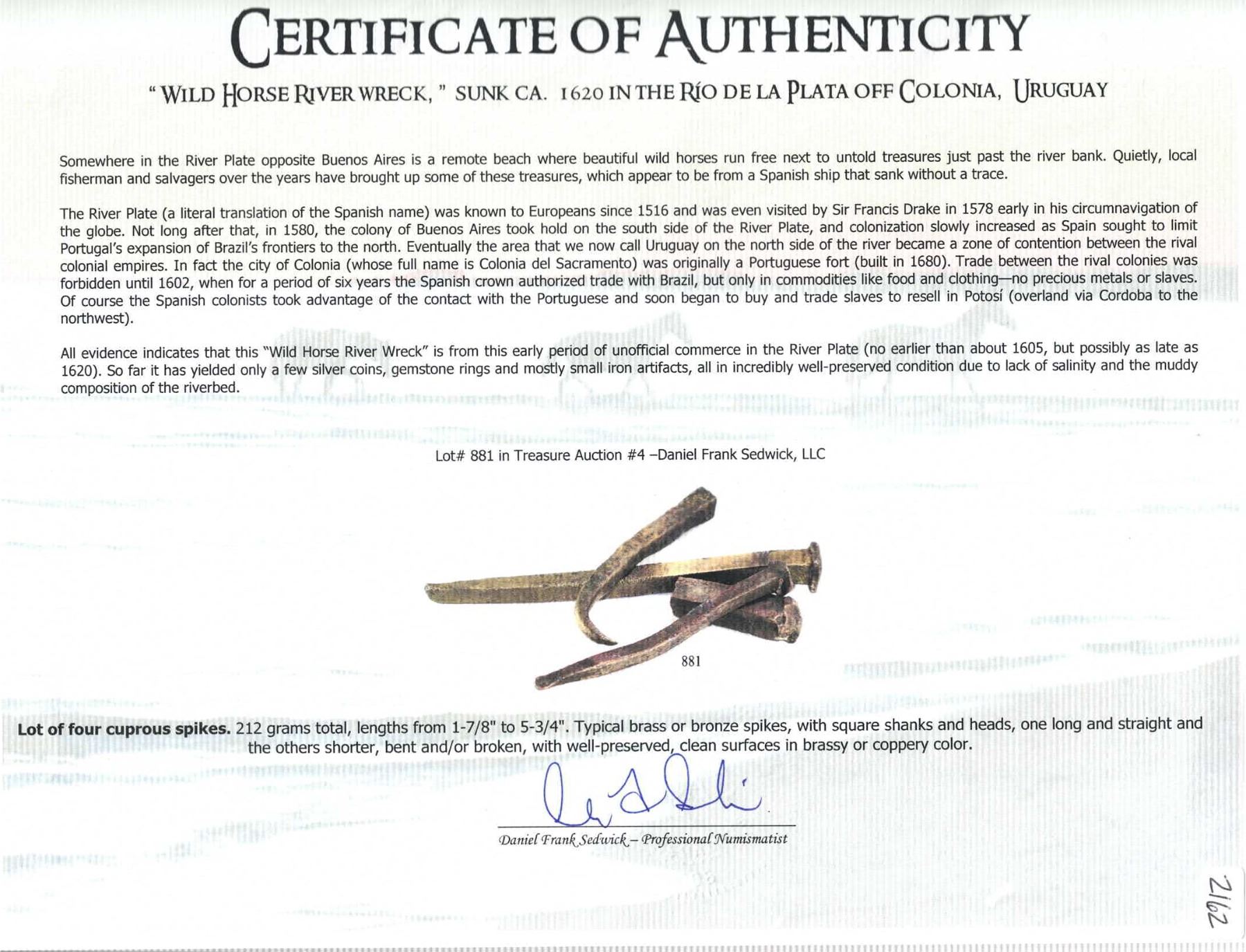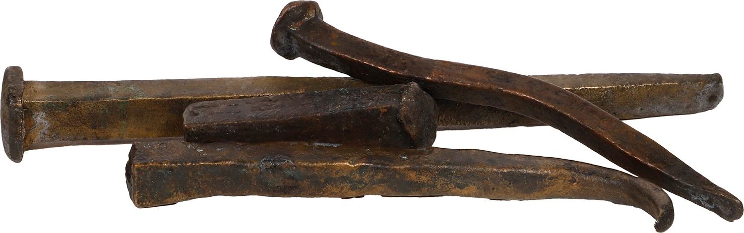 Lot of four cuprous spikes, ex-"Wild Horse River Wreck" (ca. 1620). 212 grams total. lengths from 1-7/8" to 5¾". Typical brass or bronze spikes, with square shanks and heads, one long and straight and the others shorter, bent and/or broken, with well-preserved, clean surfaces in brassy or coppery color. From the "Wild Horse River Wreck" (ca. 1620), pedigreed to Sedwick Auction 4, with original lot-tag 881 and photo-certificate.