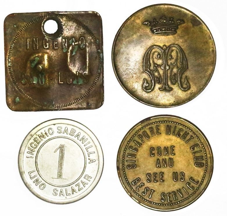 Lot of four miscellaneous Caribbean/Mexican tokens: San Luis, Cuba (Oriente Province / Santiago de Cuba), copper-nickel 1 peso, 1895, Ingenio Sabanilla / Lino Salazar; Cidra, Cuba (Matanzas Province), brass 50 centavos, no date (late 1800s to early 1900s), Marques de Montelo; Dominican Republic, square brass token, no date (late 1800s), Ingenio San Luis; Nogales, Mexico (Sonora), brass advertising piece, no date (1900s), Singapore Night Club. Rulau-Ori-88, Mat-34, Dom-77, unl. 27.42 grams total. Very interesting group from Mexico and the Caribbean: The 1895 Lina Salazar piece is AU; the Cidra piece in XF has a strong catalog value; the crude VF square token from Ingenio San Luis (Dominican Republic) has a paint-encrusted "DD" stamped over an earlier "18" stamping on the back (decidedly not a "100" countermark as mentioned in Rulau); and the Singapore Night Club token from Mexico is XF and boldly states OPEN DAY & NIGHT.