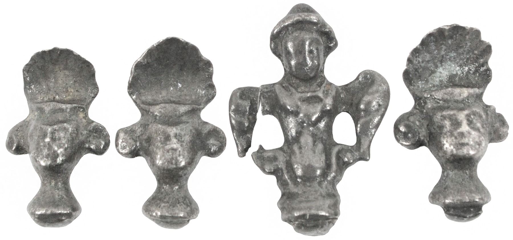 Lot of four silver finials (game tokens?) from the Luz (1752), ex-Castells & Castells (1997). 40 grams total, each about 1" tall. Little amulets showing human features, three of them with prominent headdresses, believed to be playing pieces in some kind of game, darkly toned and a bit worn from use but all intact except angel figure missing one wing. Interestingly, the Sotheby's auction of 1993 had a similar set. From the Luz (1752), pedigreed to the Castells & Castells auction of 1997 (lot 26).