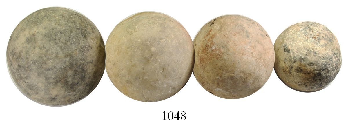Lot of four small, stone cannonballs. 1.69 kg total, each 2"-3" in diameter. Before the advent of iron and bronze cannonballs, the material of choice was stone, despite the fact that stone balls were much lighter and tended to blow apart ineffectually when fired. For that reason, stone cannonballs today are somewhat rare, especially small ones like these, which are fully intact and whitish to light gray in color. From an unidentified 1500s-1600s wreck off Santo Domingo, with Global Marine Exploration photo-certificates #SW00434, 563 and 776 and TPA10030. Recovered from: Unidentified 1500s-1600s wrecks off Santo Domingo