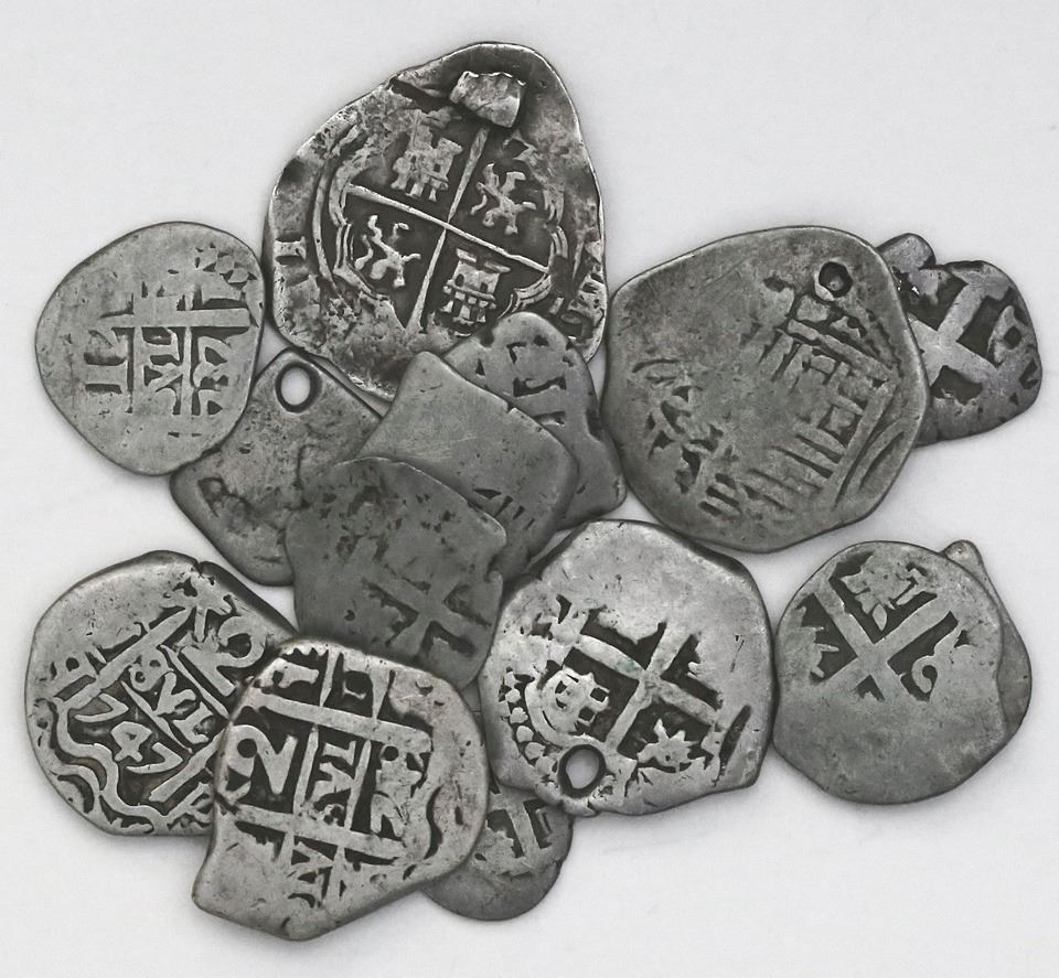 Lot of fourteen silver cob minors (1/2, 1 and 2 reales), Spanish and Spanish colonial, various periods (1600s-1700s). 53.94 grams total. All either heavily worn (G-VG) or with problems (holed, plugged or shaved), but some with clear dates and several with nice crosses, all more or less toned.
