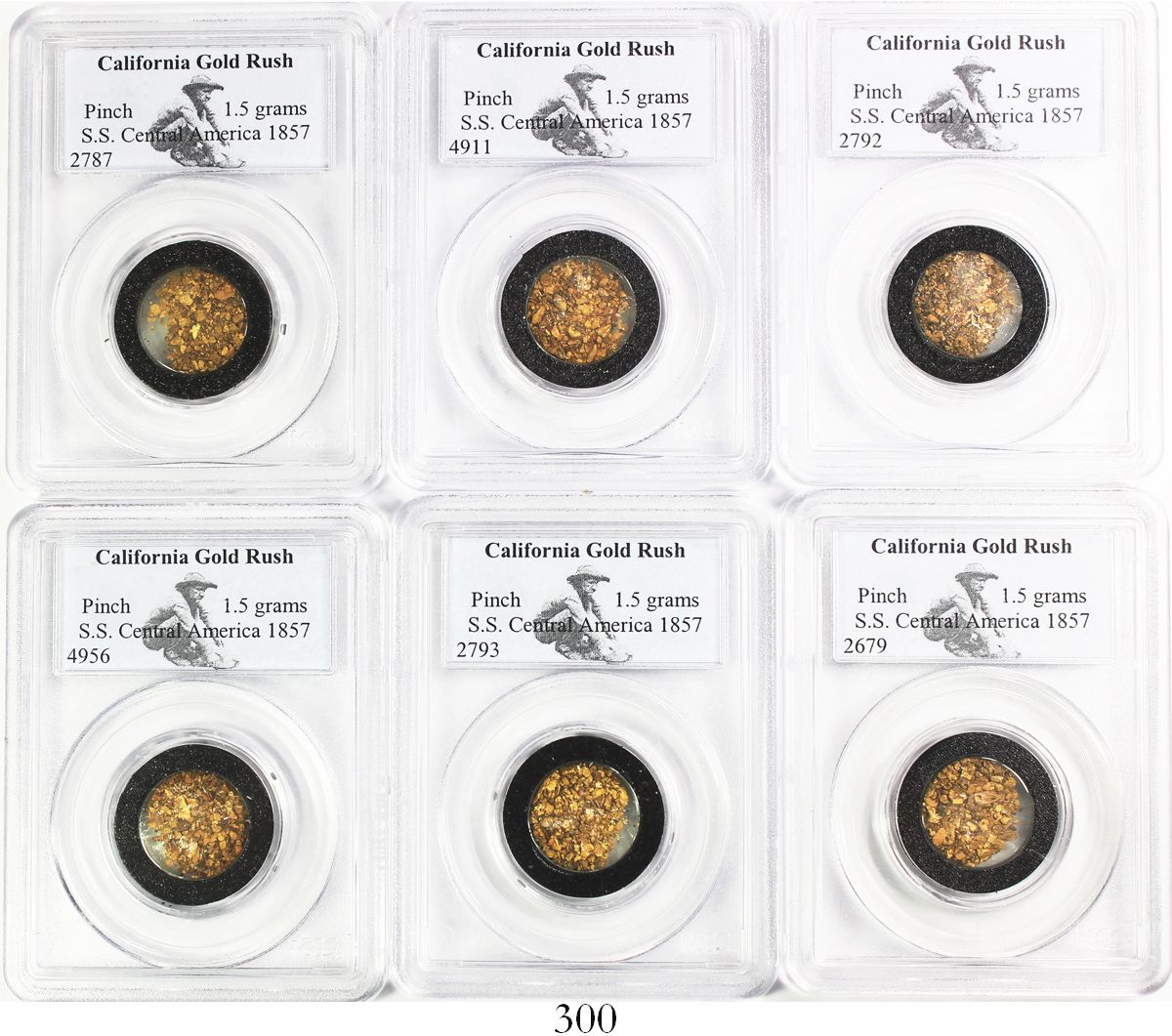 Lot of gold dust in 6 separate PCGS capsules with total weights of 1.5 grams each, from the S.S. Central America (1857). Six "pinches" of natural gold dust in official capsules, popular promotional items but also an economical way to own gold from this important provenance without spending thousands on a twenty-dollar gold piece! From the S.S. Central America (1857)