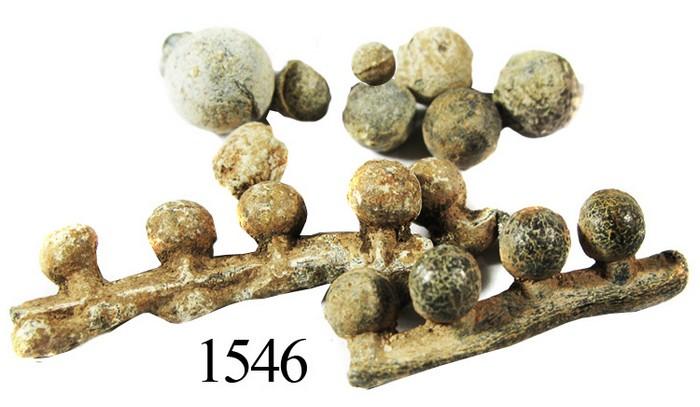 Lot of lead birdshot with 3 mold sections. 49 grams total. Unlike larger balls, which were typically made with pliers, small birdshot was usually cast in strip-molds and broken off the strips like candy dots. This lot shows both the finished product (8 individual balls) and 3 strips with the balls still attached (2 with 4 balls each and one with just one ball still attached). Found in a Spanish colonial area in the southern Caribbean, ca. 1590.