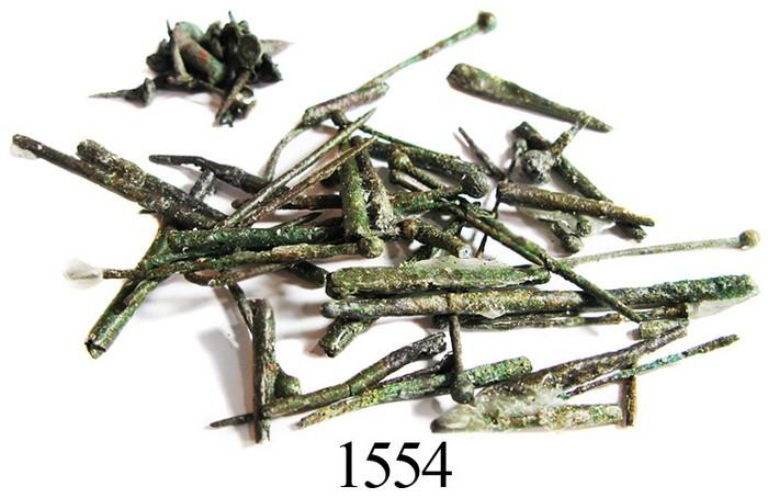 Lot of many copper needles, pins, tacks and shoe-string tips known as aglets. 28.7 grams total. Mostly flat-head tacks and sphere-head pins, but also some tubular aglets, which colonists fastened to the ends of their shoe-strings to facilitate threading and keep from fraying, mostly intact but patinated and some coated with wax. Found in a Spanish colonial area in the southern Caribbean, ca. 1590.