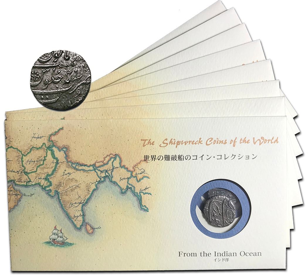 Lot of nine Surat, India (Mughal Empire), 1 rupees, Aurangzeb (1658-1707), AH1113 (1702), eight in Japanese promotional holders. The holders 8" x 4-1/4" each. All toned and corroded but with mostly bold details, the holders printed with Japanese wording. Recovered from: "Taj Mahal treasure," sunk ca. 1702 off Sri Lanka