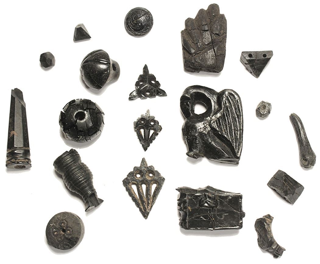 Lot of nineteen jet and ebony amulets and beads, Spanish colonial (1600s).