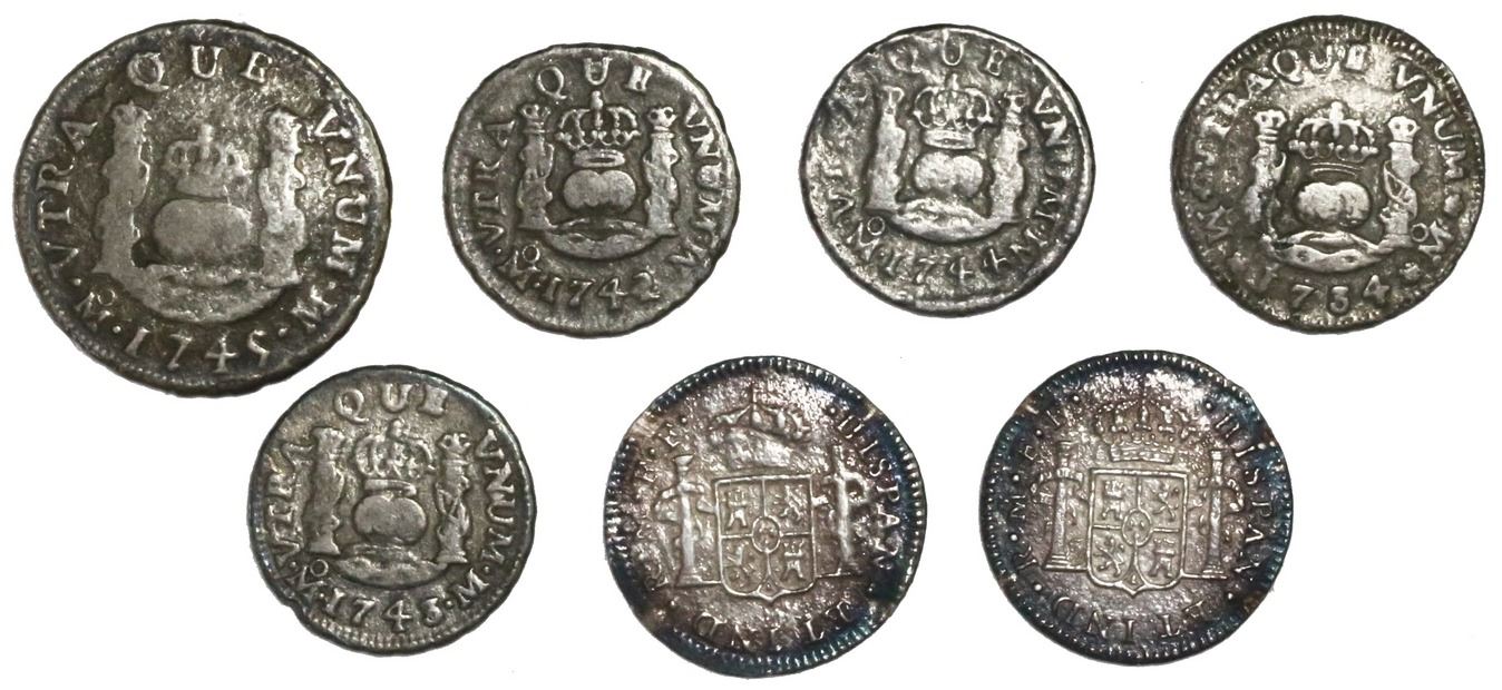 Lot of seven Mexico City, Mexico, small minor pillars and busts: 1R 1745M; 1/2R 1734MF, 1742M, 1743M, 1744M, 1783FF (2). 10.65 grams total. Minor corrosion, most with full details, the two bust coins previously mounted with heavy blue toning. Recovered from: Cazador, sunk in 1784 off New Orleans, Louisiana