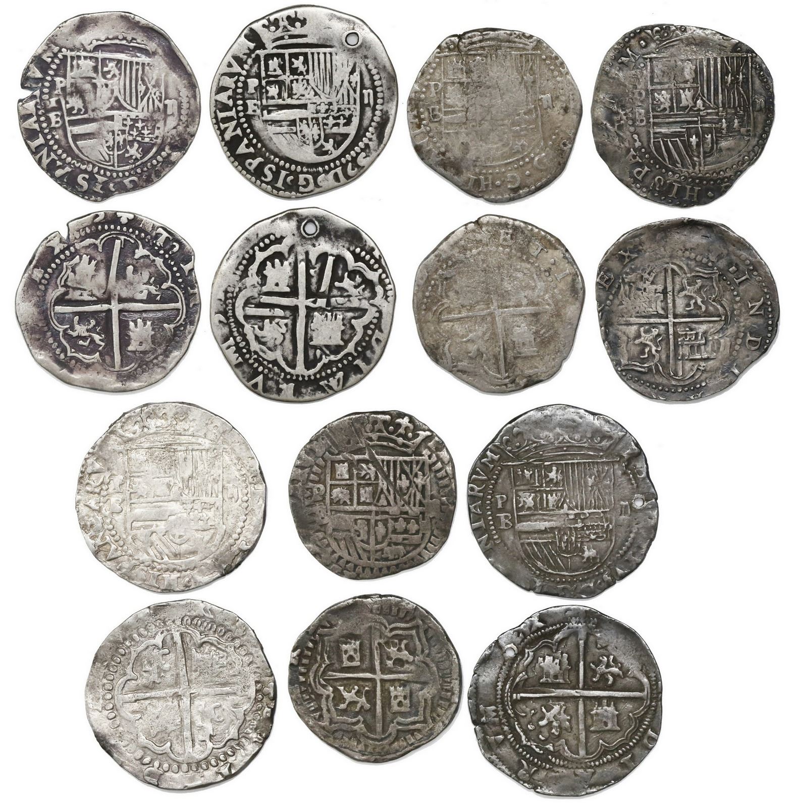 Lot of seven Potosi, Bolivia, cob 2 reales of Philip II assayer B (various periods). KM-3.2. 46.16 grams total. AVF-XF, most nicely toned, all with full shields and crosses and clear assayers, in any case a nice mix of varieties (mostly early), two holed at edge. SEE INTERNET FOR PHOTO.