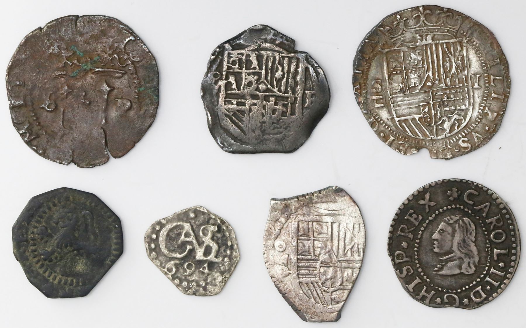 Lot of seven Spanish and Spanish colonial silver (five) and copper (two) cobs, various mints and periods (1500s-1600s). 19.63 grams total. Wide assortment of decent cobs in VF-XF grade, all toned, including a Barcelona croat (1R) 1675, Santo Domingo 4M of Charles-Joanna, etc. One of the Mexican 1R pedigreed to the Ponterio auction of November 2007, with original lot-tag #602.