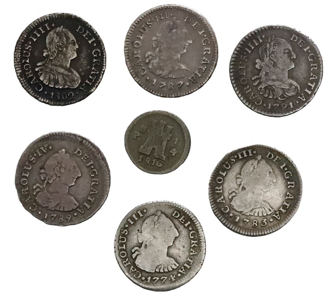Lot of seven Spanish colonial (various mints) bust 1/2R (six) and 1/4R (one), as follows: Santiago, 1/2R, 1802JJ; Popayan, 1/2R, 1774JS; Lima, 1/2R, 1783MI, 1787/6MI, 1789IJ, 1791IJ; Popayan, 1/4R, 1816. Mixed group of better small minors, particularly the scarce Popayan 1774JS 1/2 real.