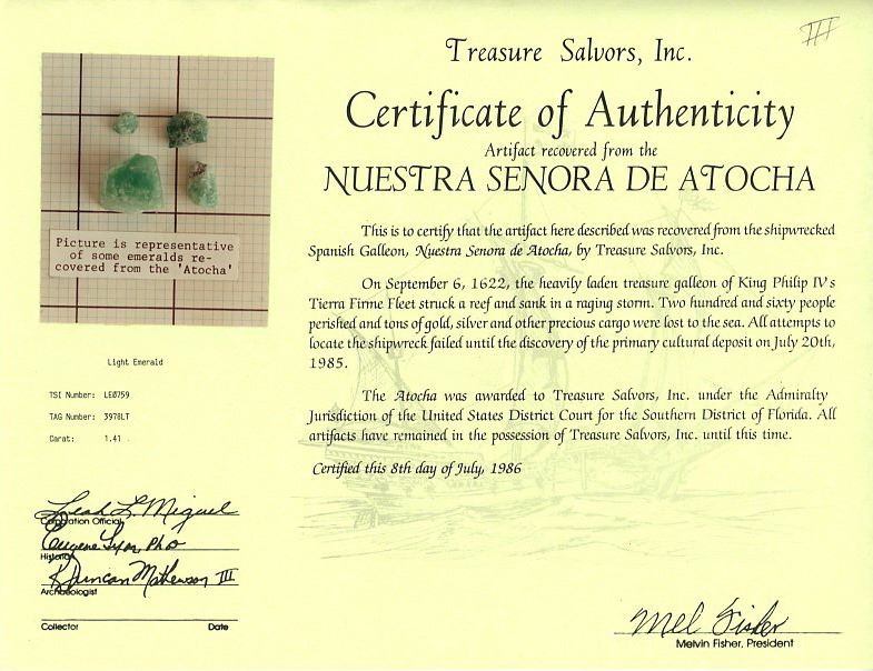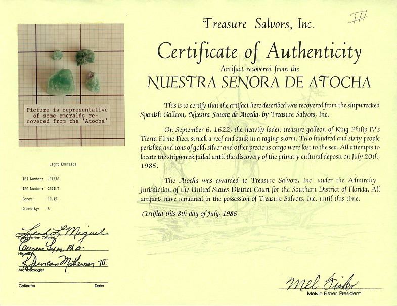 Lot of seven natural (light) emeralds with two certificates, six totaling 10.15 carats plus one at 1.41 carats, from the Atocha (1622). About 1/4" to 3/8" per stone. Light green (with white areas) and opaque but all of "usable" size (i.e., not just chips or slivers), six of them certified together for unknown reasons. With Fisher tag and photo-certificates #2071LT and 3978LT.