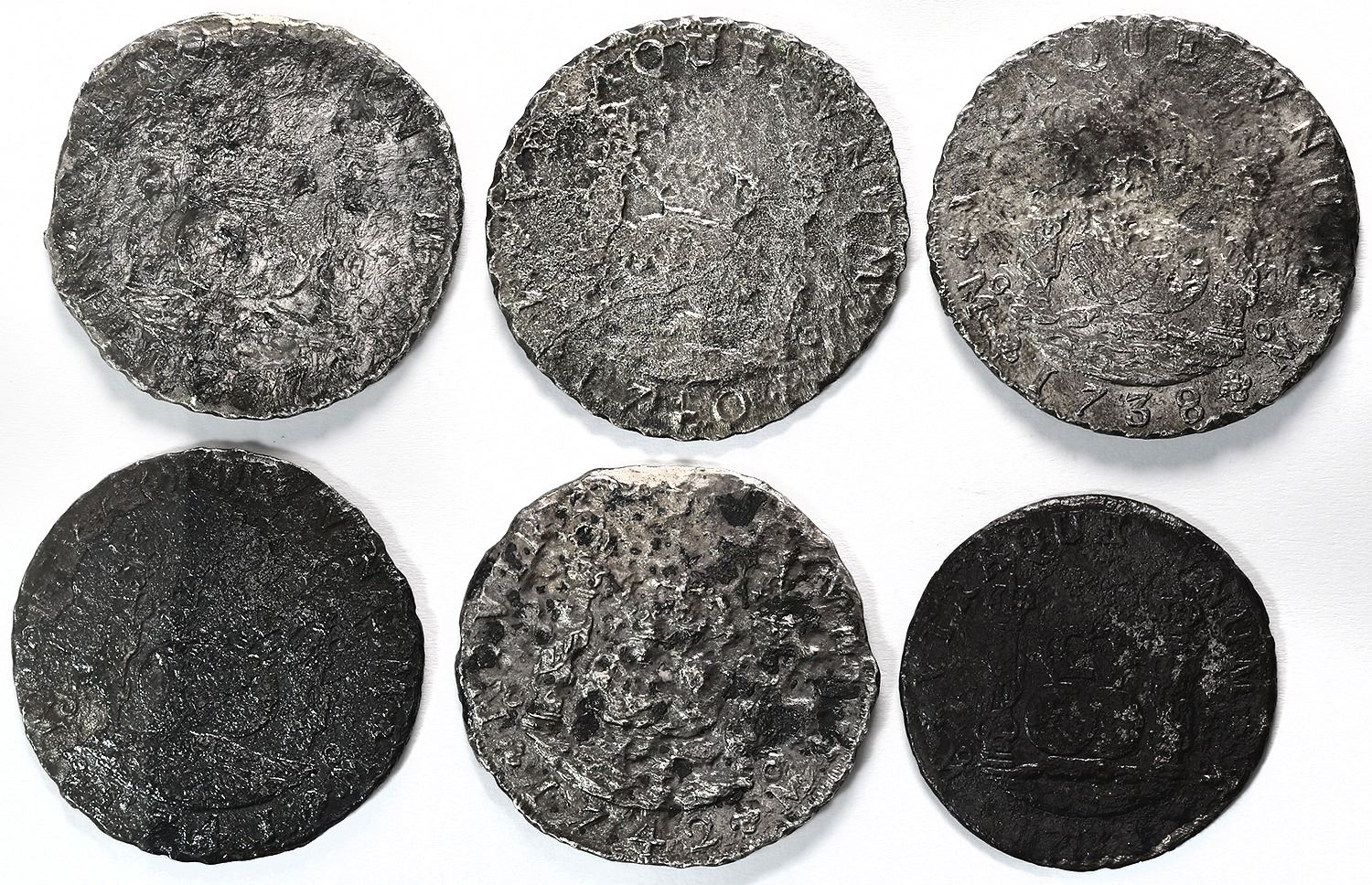 Lot of six Mexico City, Mexico, pillar 8 reales (five) and 4 reales (one), various dates (all visible). 108.00 grams total. All corroded with some retained detail, a few darkly toned. With certificates. From: Hollandia, sunk in 1743 off the Isles of Scilly, southwest of England