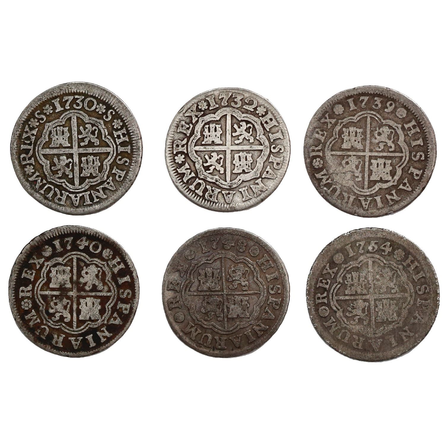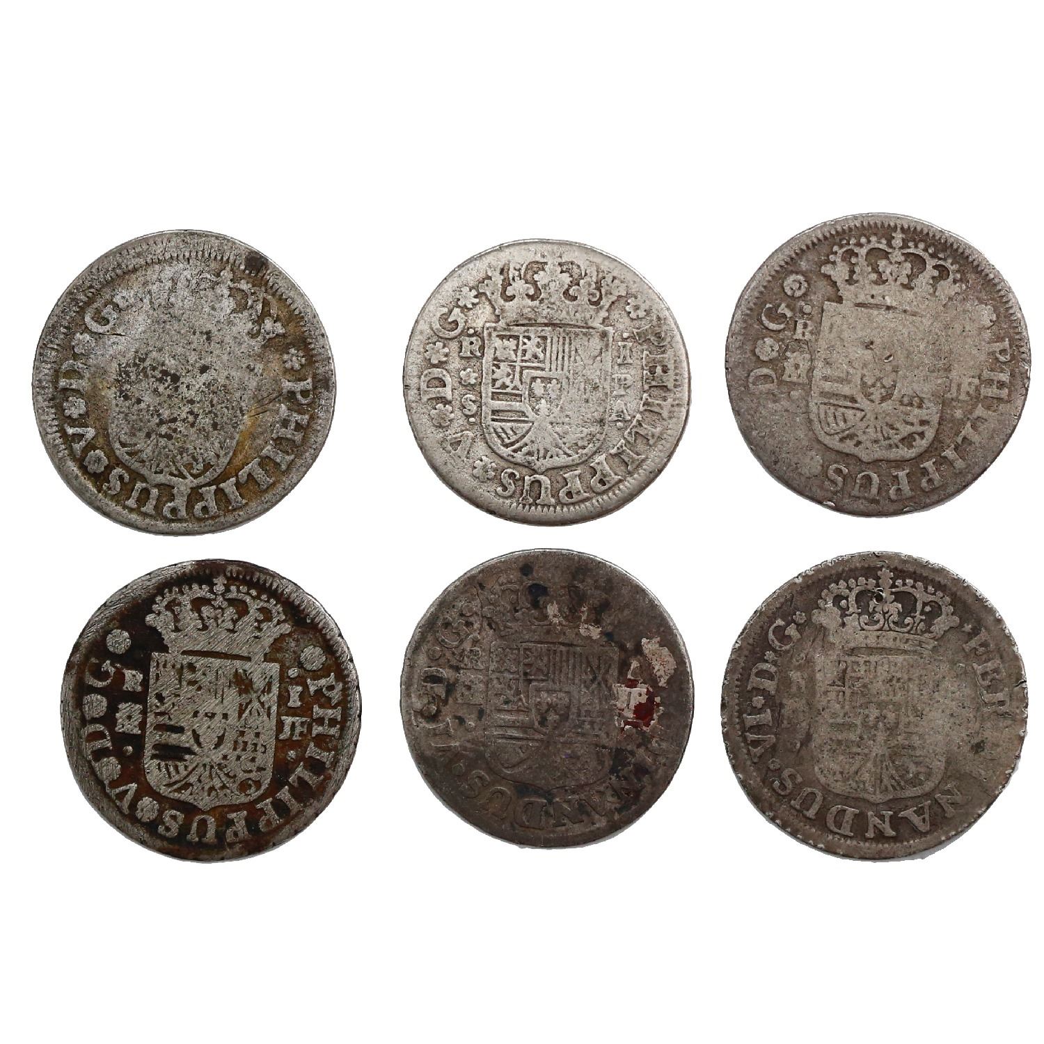 Lot of six Spanish 1R "half pistareens," Philip V and Ferdinand VI, various mints and dates and assayers. 14.98 grams total. Well-circulated group with most around VG to Fine, some with surface stains or hairlines.