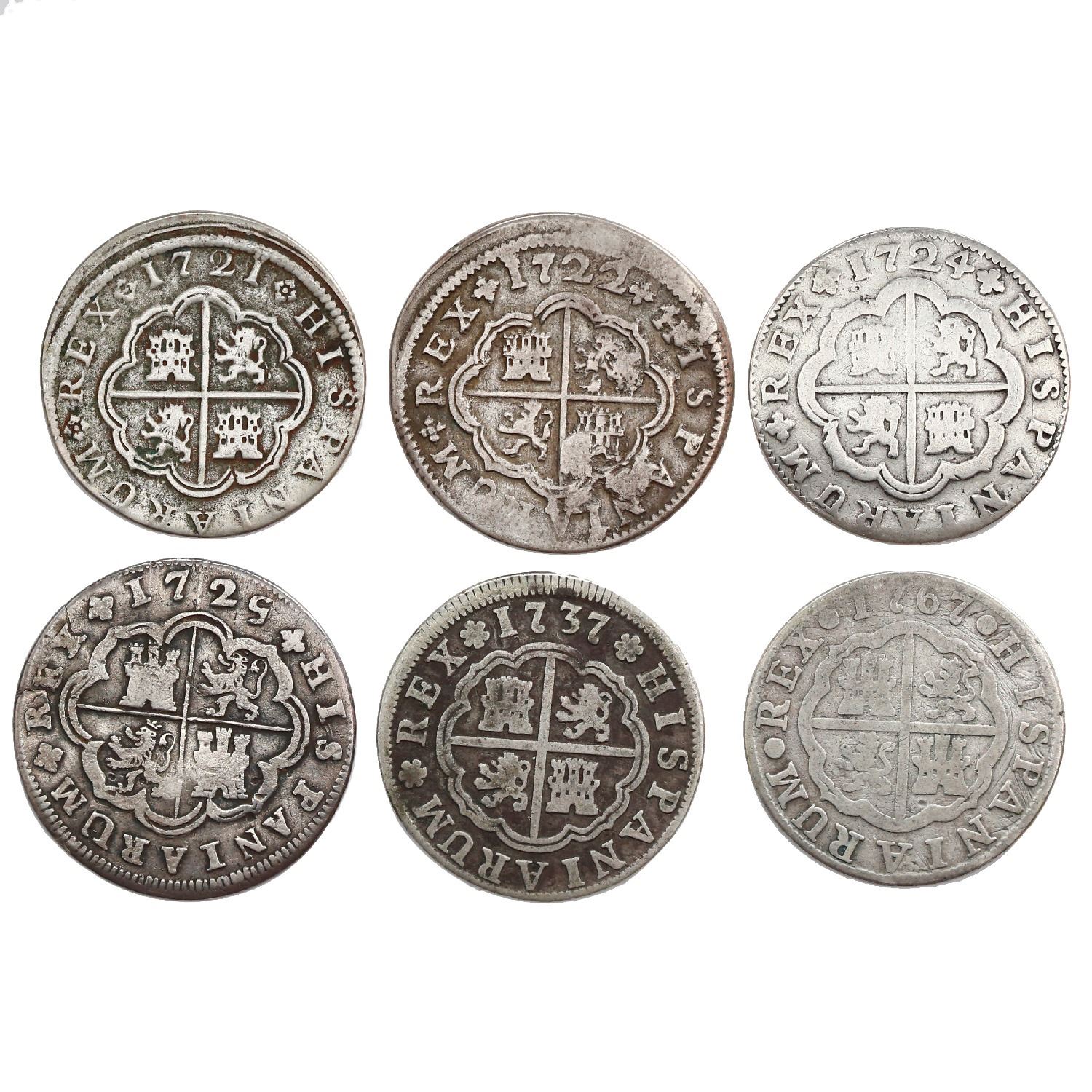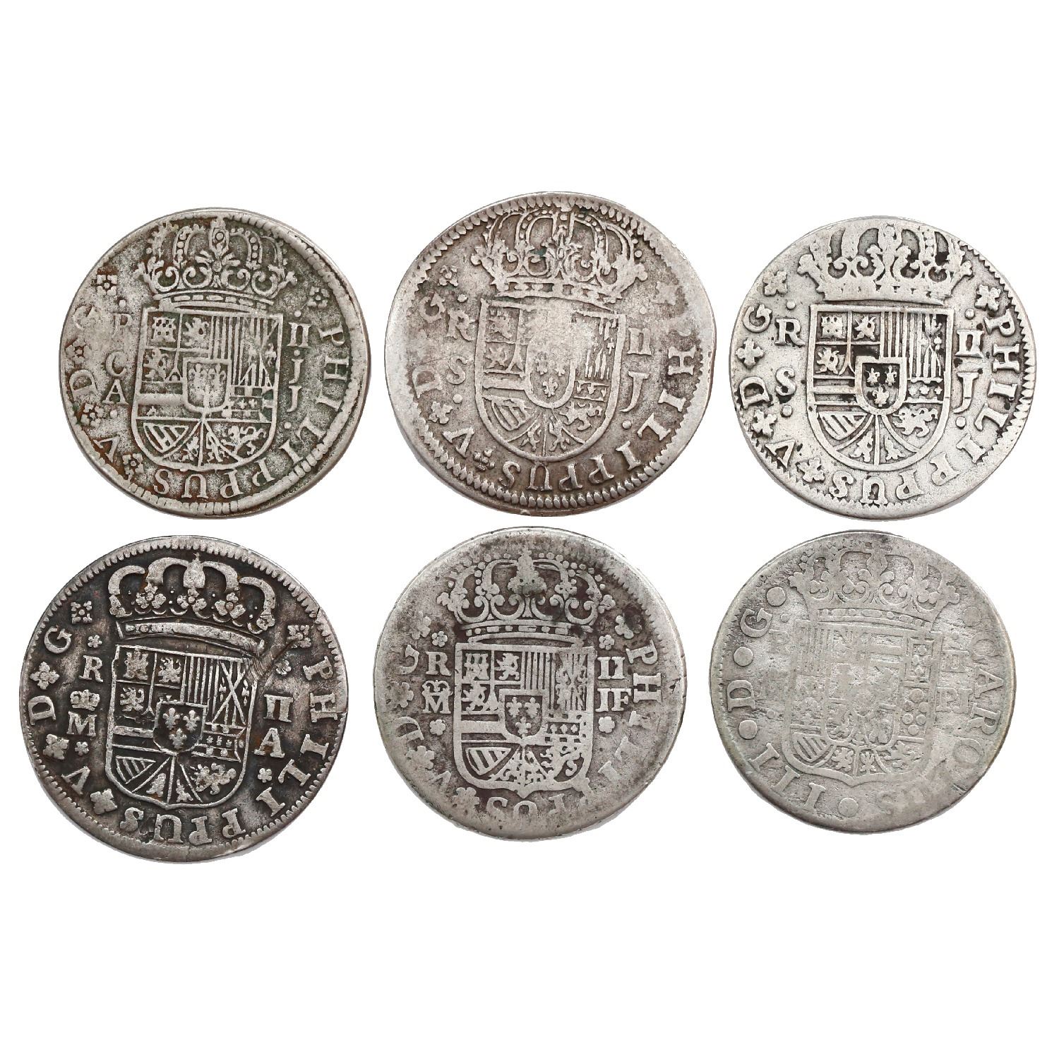 Lot of six Spanish 2R "pistareens," Philip V and Charles III, various mints and dates and assayers. 28.97 grams total. Around Fine, a few rather worn but generally fully detailed.