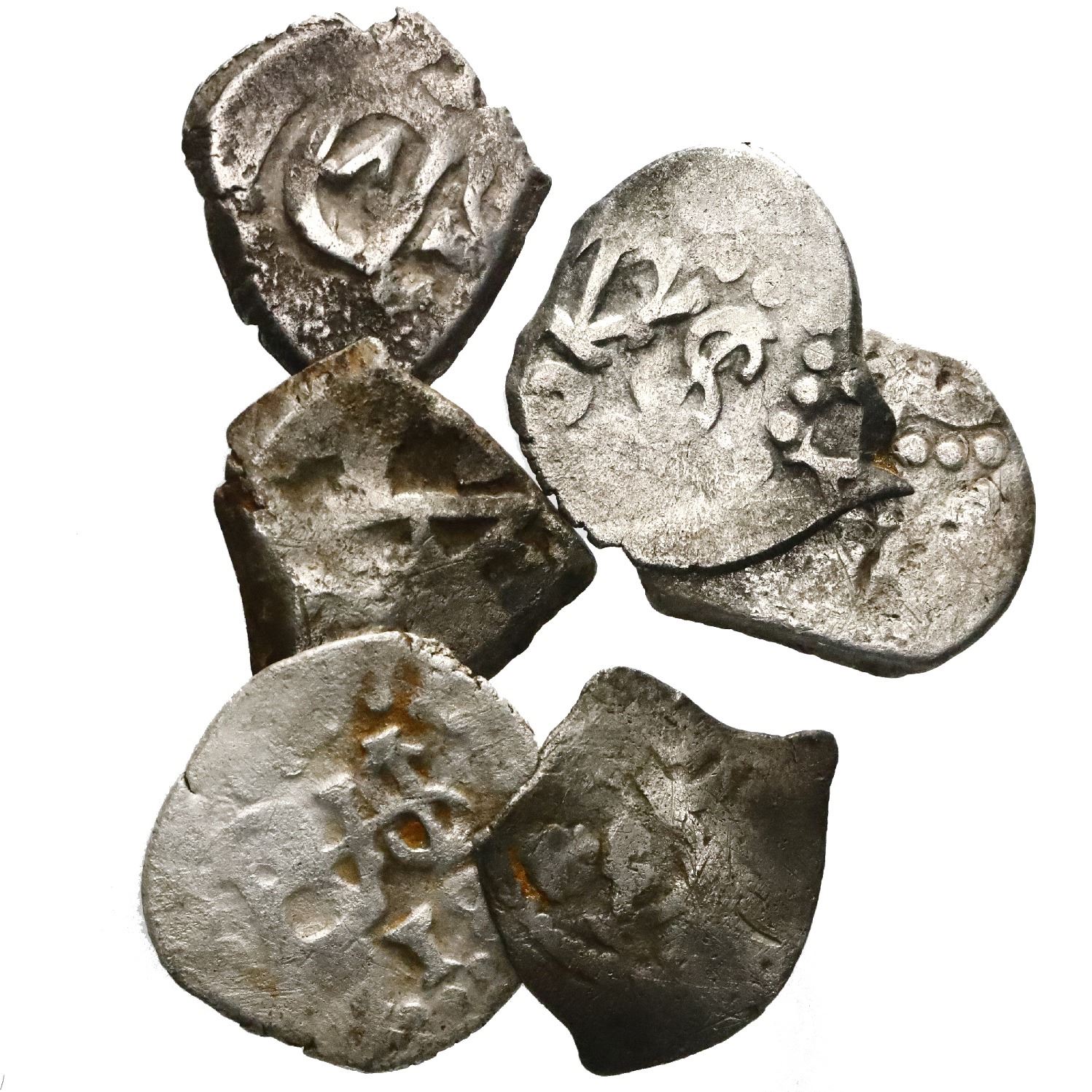 Lot of six Spanish colonial cob 1/2R: one Mexico, Charles II; three Lima, Philip V (two) and Louis I; two Potosi, Ferdinand VI and Charles III. 8.44 grams total. Nice group with one of the Limas having a visible 1718 date plus a scarce Louis I piece, all with some monogram and cross detail.