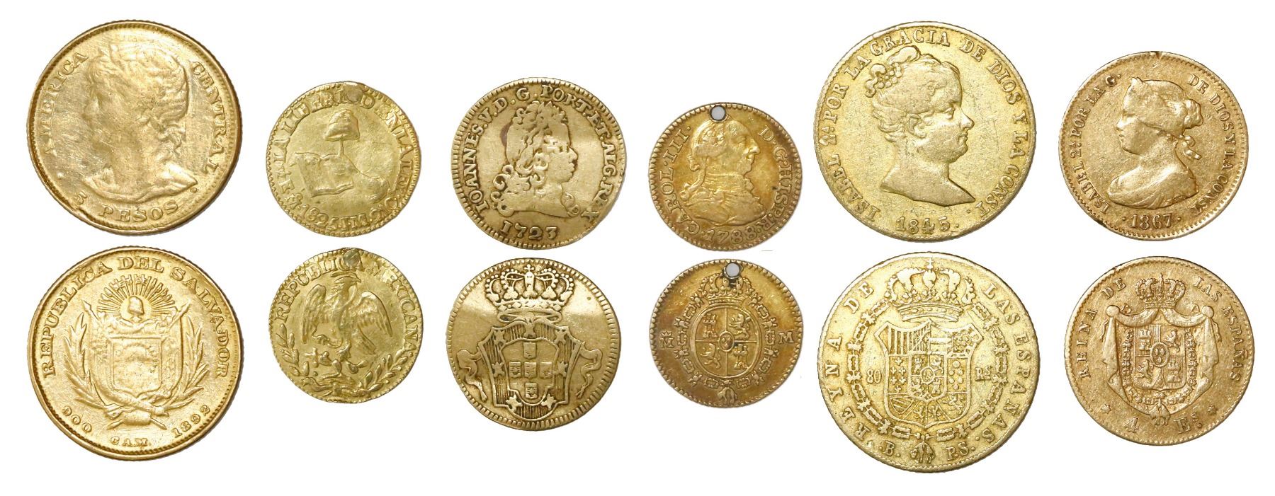 Lot of six small gold coins from various countries: El Salvador, 5 pesos, 1892CAM; Mexico, 1/2 escudo, 1825JM; Portugal, 1/2 escudo, 1723; Spain, 1/2 escudo, 1788M; Spain, 80 reales, 1845PS; and Spain, 4 escudos, 1867. 21.49 grams total. Fine to XF, some toned and some lustrous, each with some kind of damage (like hole, hairlines, tooling, etc.) but with clear design elements.