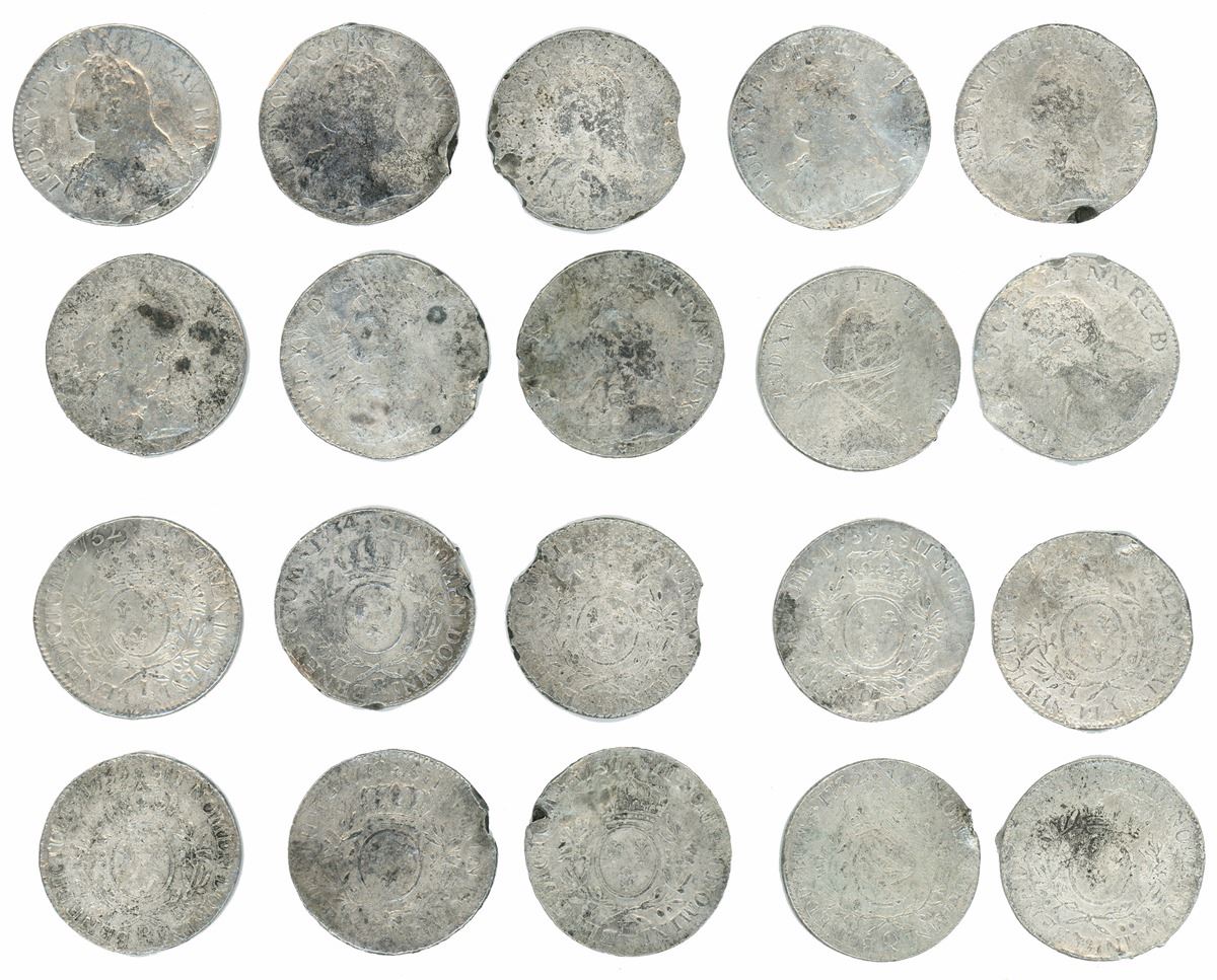 Lot of ten French ecus, Louis XV, small bust, 1730s dates, various mints. 265.86 grams total. Only minor damage and corrosion, mostly clear details and all with dates visible. Recovered from: Dromadaire, sunk in 1762 off the Cape Verde Islands, west of Africa