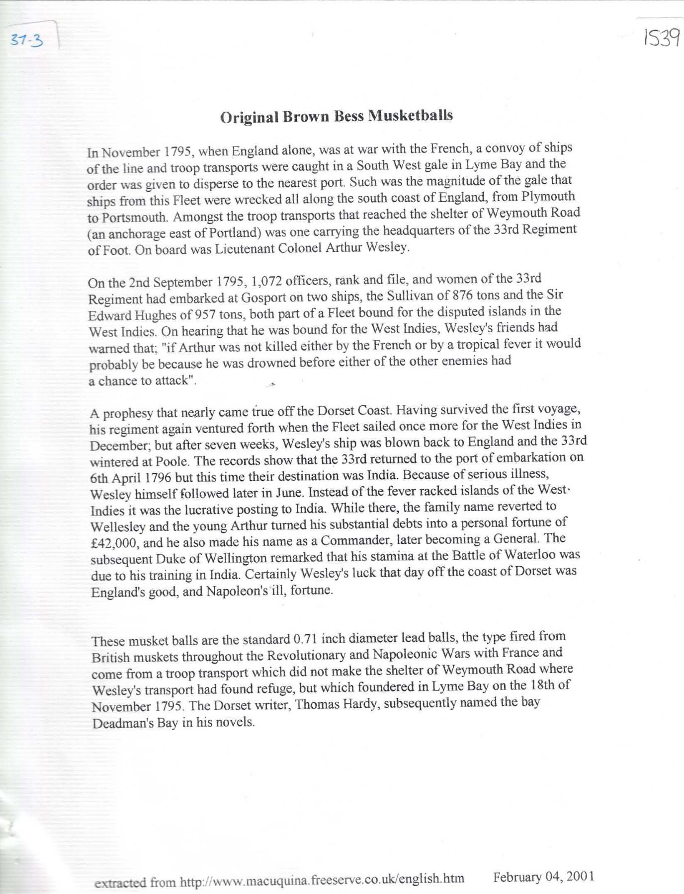 Lot of ten lead musketballs, ex-Piedmont (1795). 375 grams total. Roughly ½" in diameter. Typical lead musketballs with accompanying letter written before the ship was identified as the Piedmont and describing instead the whole fleet of ships that sank in Lyme Bay and particularly one of its occupants, the future Duke of Wellington and important leader in the Battle of Waterloo, Arthur Wellesley (né Wesley). Also stated in the letter is the fact that these musketballs are for a brown bess musket. From the Piedmont (1795), with undated and unsigned letter from salvor Selwyn Williams describing the 1795 sinking and these musketballs specifically.