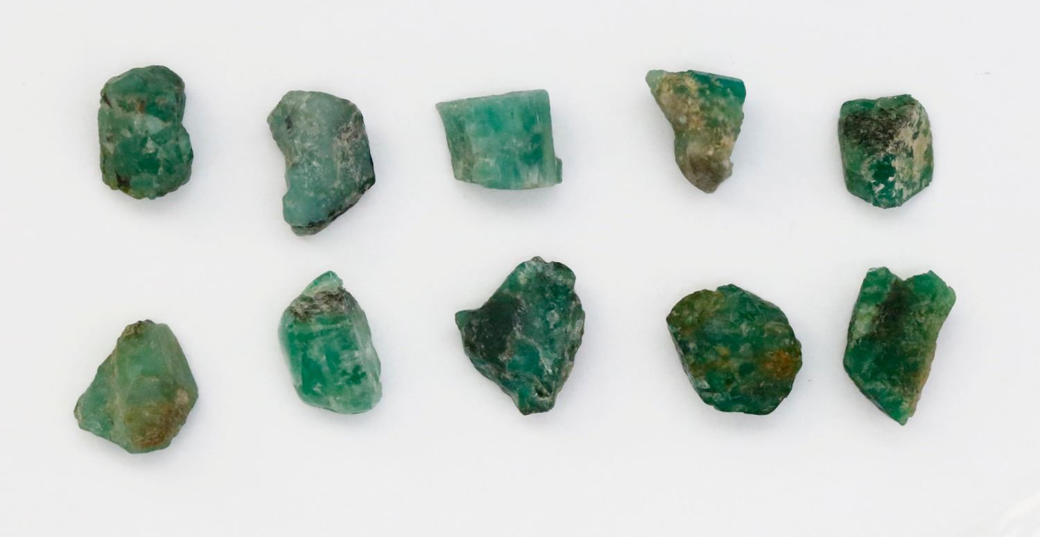 Lot of ten natural emeralds, 1-2 carats each. About 1/4" to 1/2" each. Olive-green color, some dark, some light, and the rest in between, all opaque with black or white encrustation, useful size for mounting. From the Maravillas (1656), with photo-certificates #CE0521, 543, 559, 596, 602, 606, 644, 656, 659 and 663.