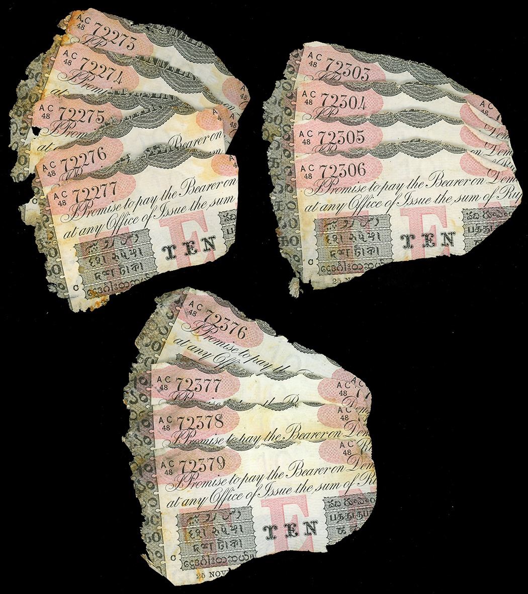 Lot of thirteen Calcutta, British India, 10 rupees notes, 25-11-1916, series AC, sequential serial numbers 72273-72277, 72303-72306 and 72376-72379. SCWPM-A10h. Several different groups of consecutive notes, all mostly intact (about 60%) with circular edge degradation and some staining. With original certificates from the salvor. From: S.S. Camberwell, sunk in 1917 off the Isle of Wight, south of England
