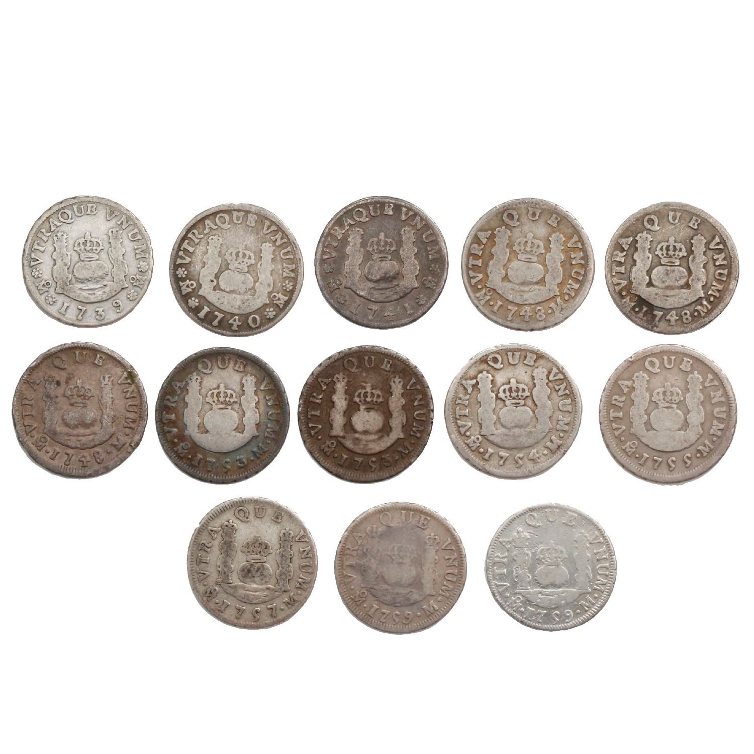 Lot of thirteen Mexico City, Mexico, pillar 1R, Philip V and Ferdinand VI, various dates and assayers. 40.80 grams total. Philip V: 1739 MF, 1740 MF, 1741 MF; Ferdinand VI: 1748/7 M, 1748 M (two), 1753 M (two), 1754 M, 1755 M, 1757 M, 1759 M (two). Most around Fine with a few slightly better, some with surface stains or cleaning.