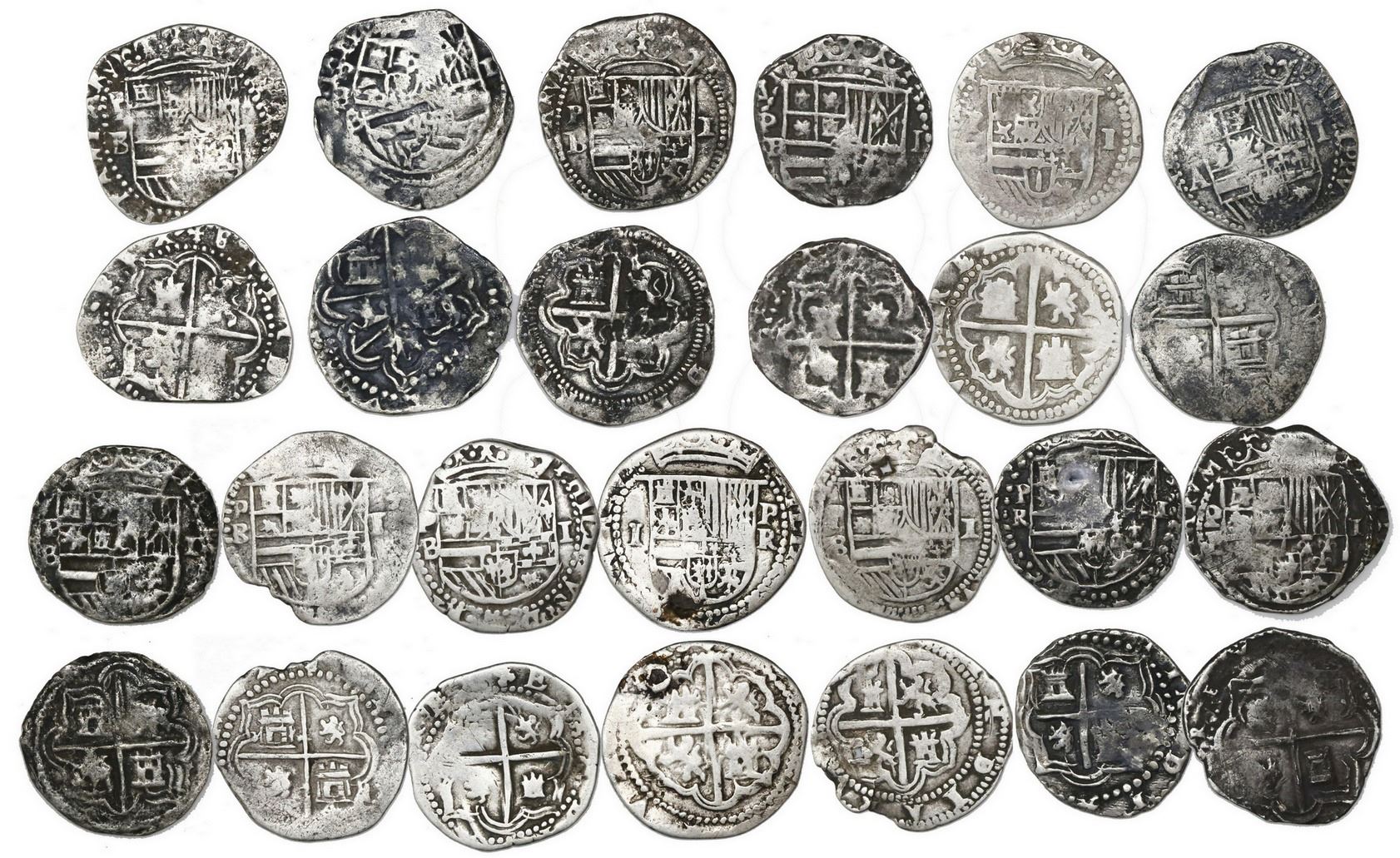 Lot of thirteen Potosi, Bolivia, cob 1R, Philip II, assayers R (Rincon), L, B, A and R (Ramos). KM-2.2. 39.63 grams total. Fine+ on average, all more or less toned, some salvaged, the Rincon and one of the B's holed, the L and Ramos plugged, mostly full shields and crosses, good lot for study. SEE INTERNET FOR PHOTO.