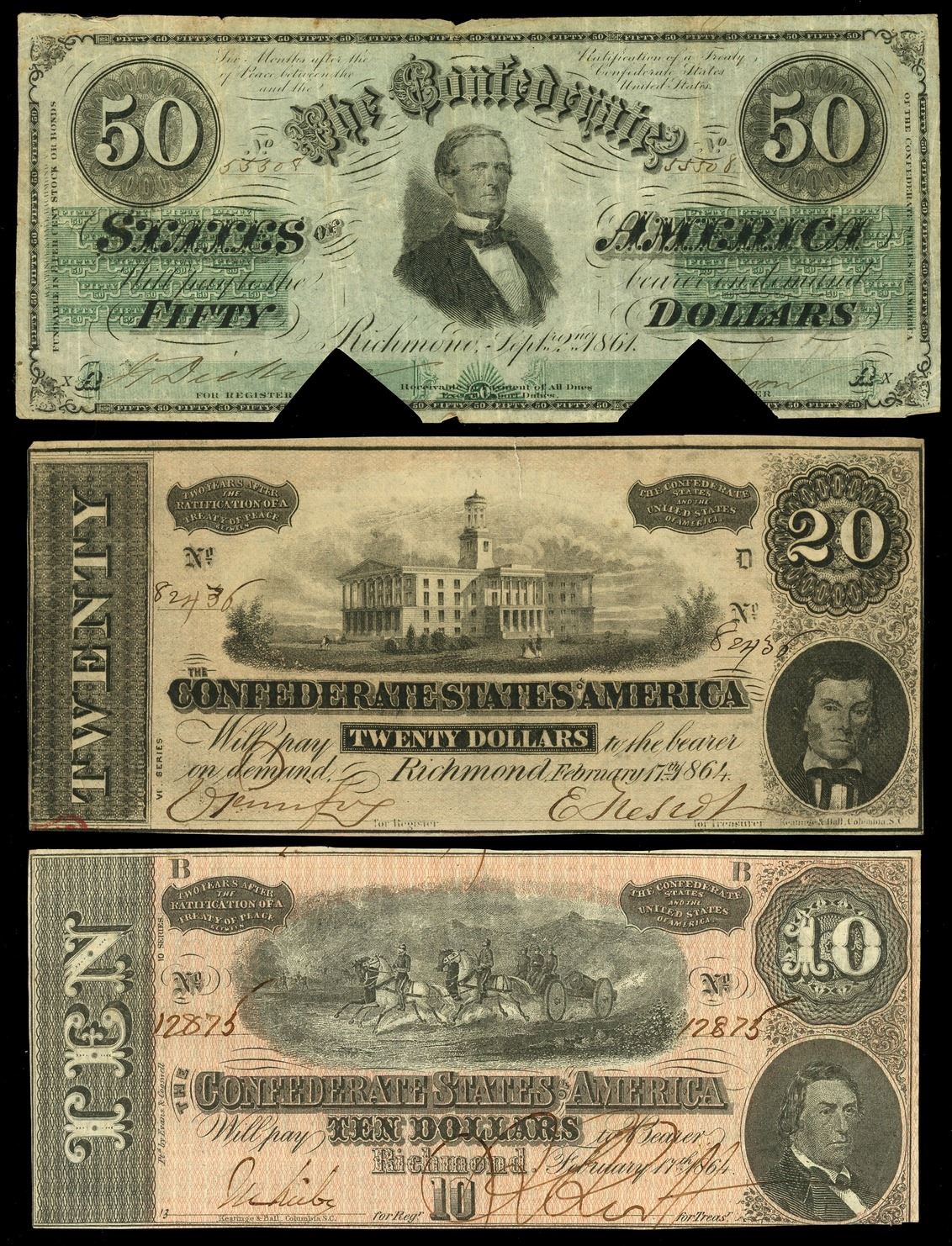 Lot of three Confederate States notes, 1861-64. T-16, 67, 68. $50, Sept. 2, 1861, serial 55508, plate xA, cancelled Fine with some pinholes and ink annotation on the reverse; $20, Feb. 17, 1864, series VI, serial 82436, plate D, AU with a gutter fold error at the lower left corner and a 1/2" tear at top; $10, Feb. 17, 1864, series 10, serial 12875, plate B, VF.