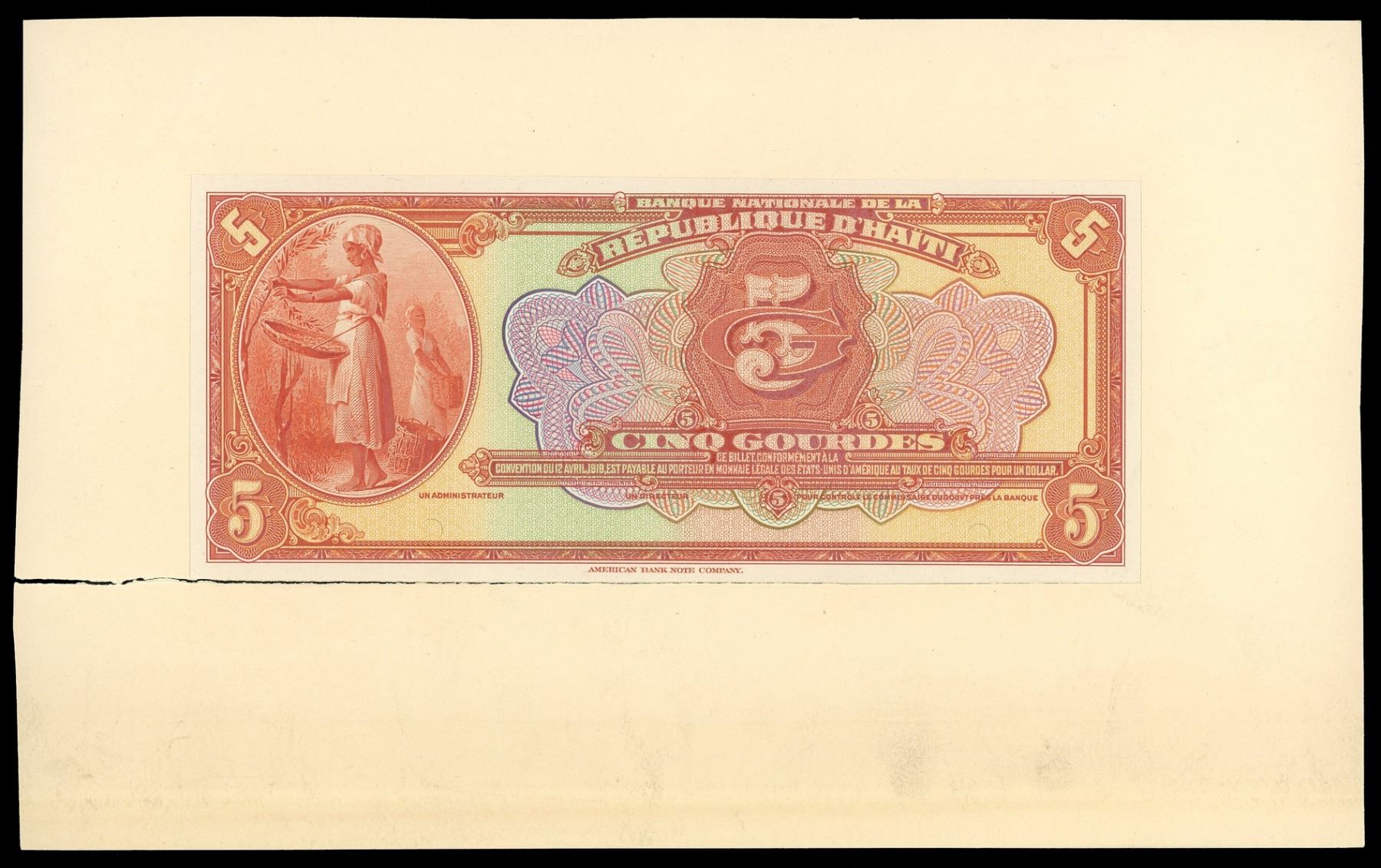 Lot of three Haiti, Banque Nationale de la Republique proofs: 5 gourdes front and back proof, 1919 (1925-32), "POUR CONTROLE" signature title; 5 gourdes front proof, 1919 (1946-50), "UN ADMINISTRATEUR" signature title. SCWPM-162p, 172p. All three are colorful UNC proofs mounted on cardstock, with tears in the cardstock on the first two proofs not affecting the notes themselves.