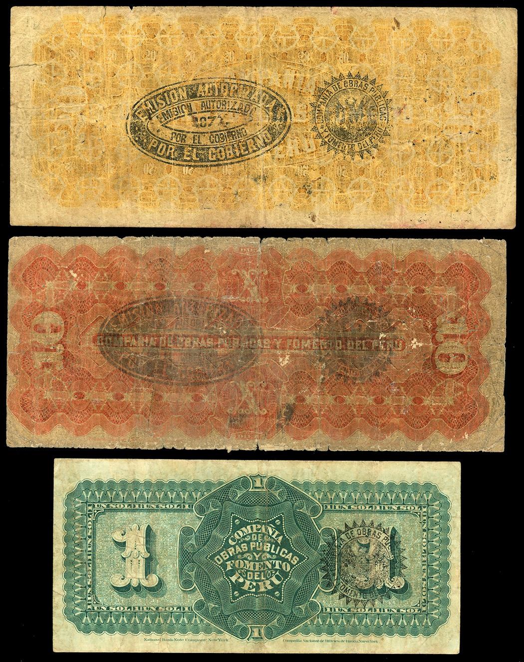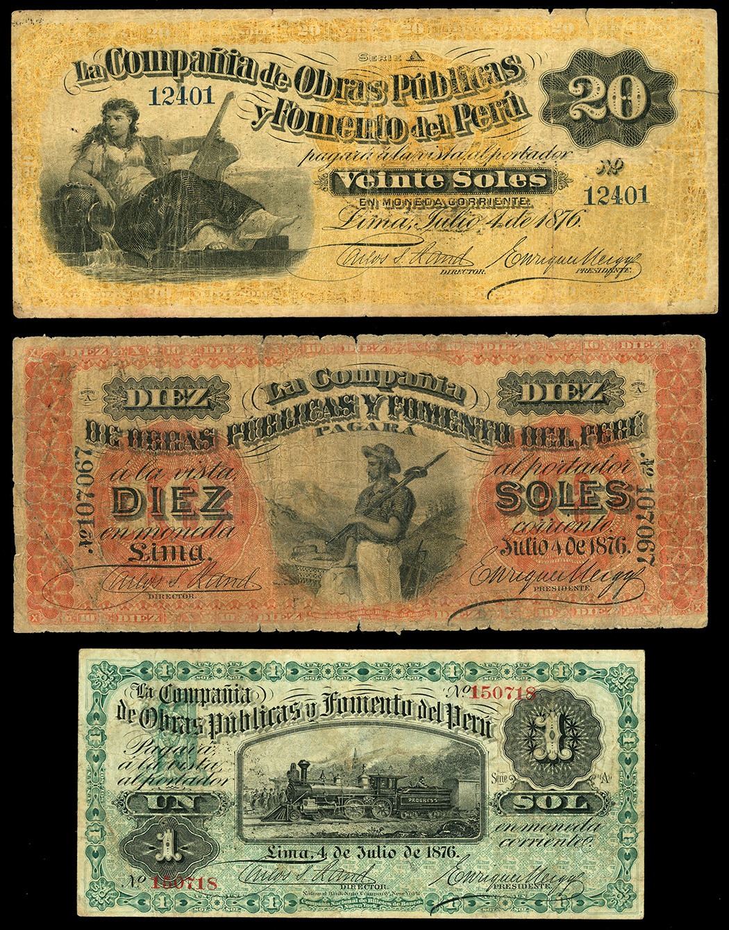 Lot of three Lima, Peru, Compania de Obras Publicas y Formento del Peru, 4-7-1876, series A notes: 20 soles, serial 107067; 10 soles, serial 107067; 1 soles, serial 150718. SCWPM-S447a, S446a, S444a. Issued by the American-born Henry Meiggs (1811-1877) to finance the construction of a railway line from La Oroya to Cerro de Pasco, Peru. His printed signature, as Enrique Meiggs, is found in the lower right. The 20 and 10 soles grade VG with edge splits while the 1 sol is closer to VG/Fine, all with pinholes, rather bold inking kept the obverses from fading during heavy circulation.