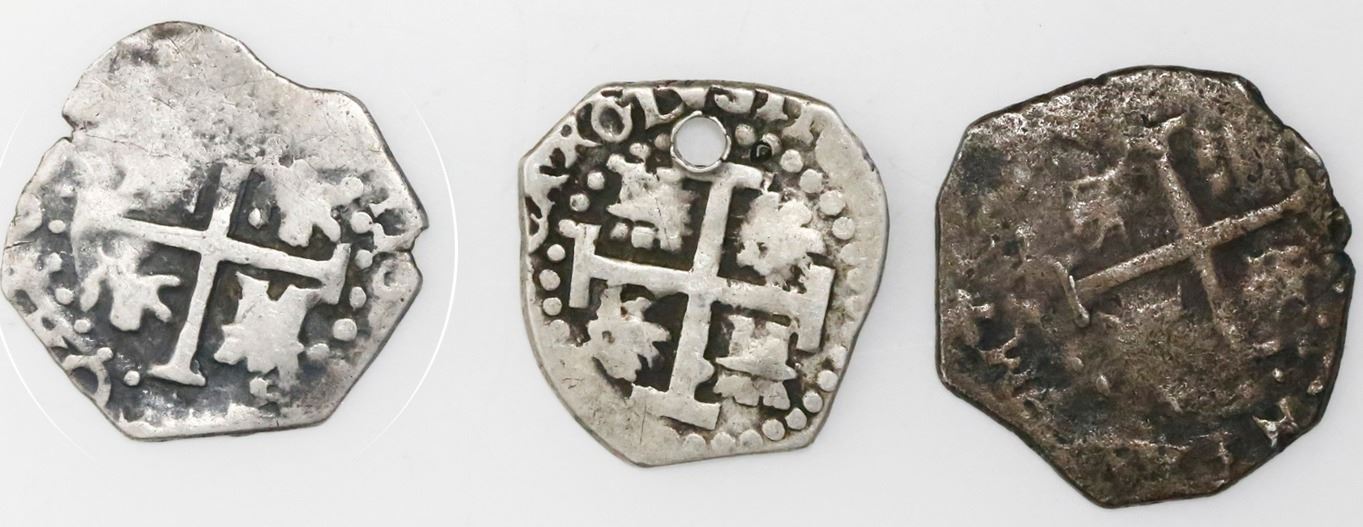 Lot of three Lima, Peru, cob 1/2R of Charles II, as follows: 1684, 1685 and 1694. KM-22. 5.02 grams total. All choice strikes with full crosses and monograms and dates (the 1685 and 1694 each with two bold dates), VF or so, but the 1684 holed and the 1685 slightly porous.