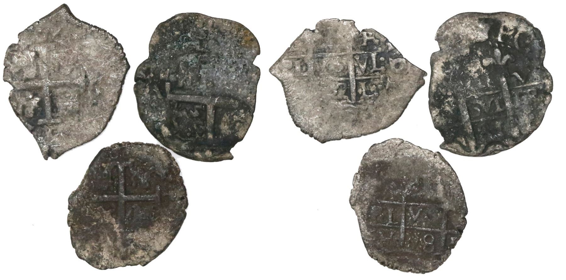 Lot of three Lima and Potosi cob 1R, uncleaned as found, as follows: Lima 1698H, Lima 1792H and Potosi 1681V. 7.46 grams total. Clear pillars and crosses despite encrustation and dark surfaces as uncleaned, all with visible dates and assayers. Recovered from: Spanish 1715 Fleet, east coast of Florida