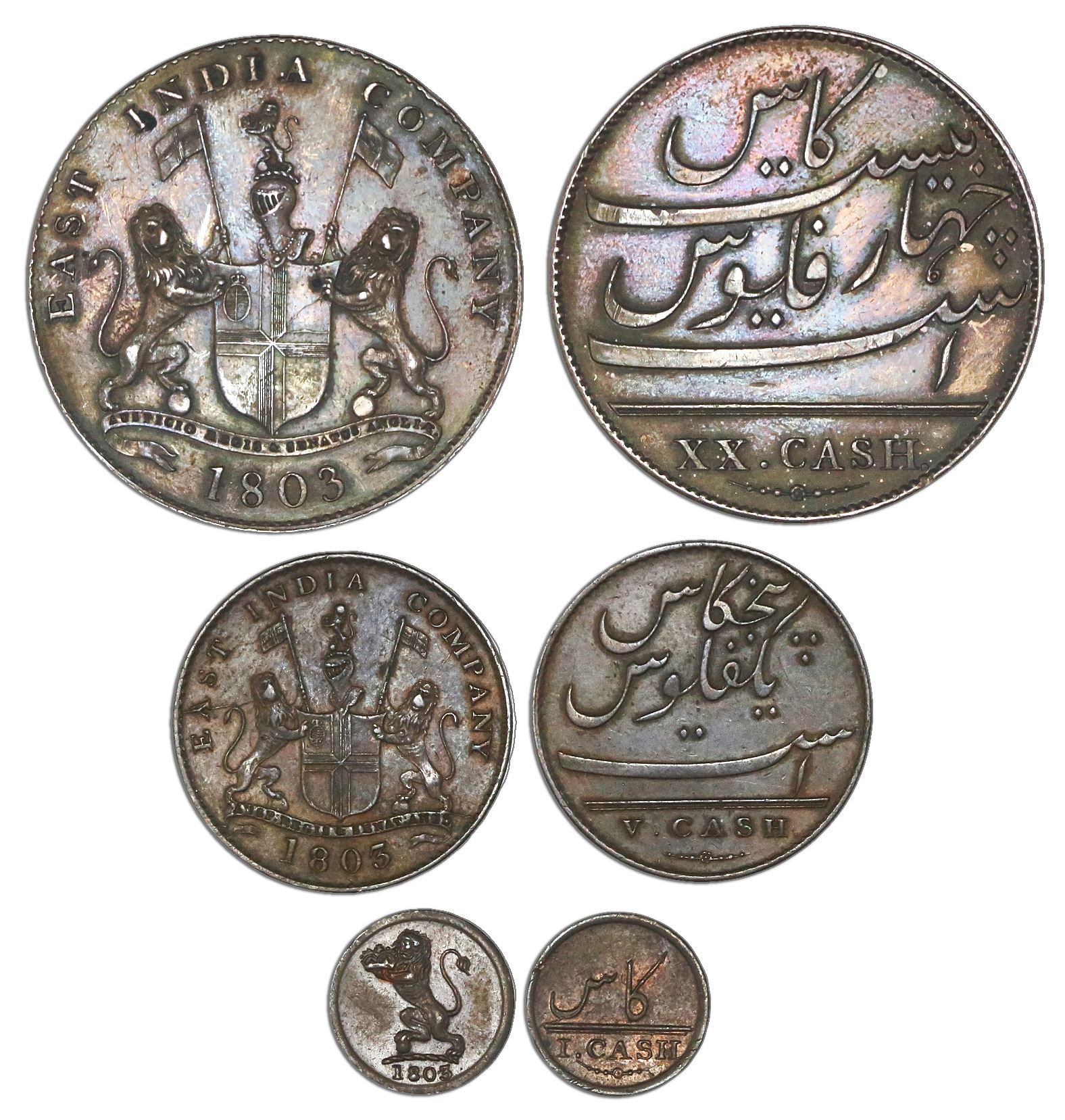 Lot of three Madras, India, copper cash coins dated 1803: XX cash, NGC UNC details / cleaned; V cash, NGC AU 53 BN; I cash, NGC MS 63 BN. KM-321, 317, 315. All dark, the XX and I cash choice with hints of original luster, some high-point wear on the V cash. NGC #4725070-005, -006, -007.