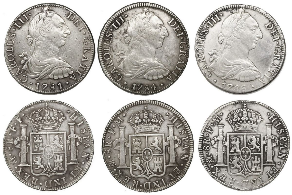 Lot of three Mexico City, Mexico, bust 8 reales, Charles III, 1781FF, 1784FM and 1786FM.