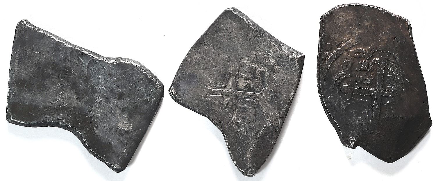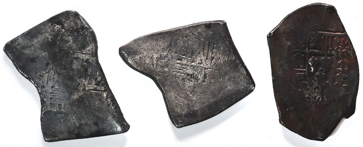 Lot of three Mexico City, Mexico, cob 8 reales, Charles II and Philip V, assayers L and J (where visible). 79.16 grams total. Each VF or so with some shield and cross detail, darkly toned and irregularly shaped.