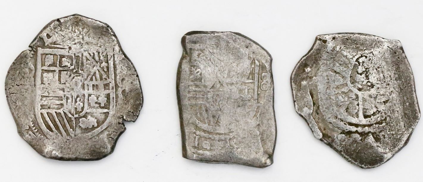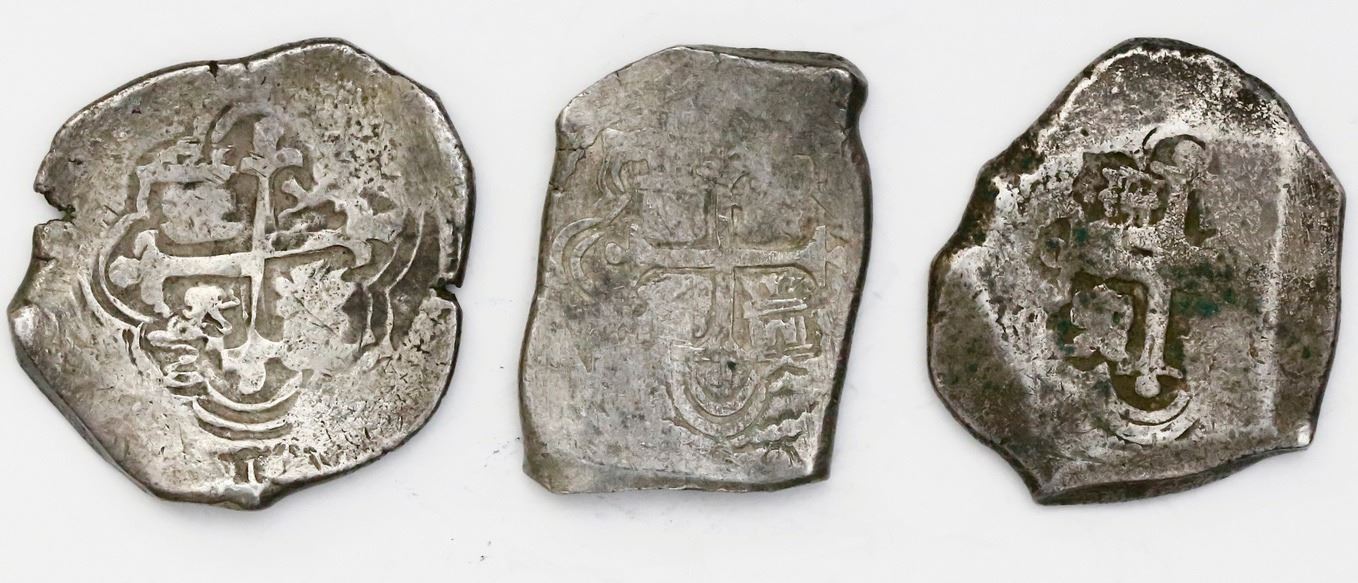 Lot of three Mexico City, Mexico, cob 8 reales, Philip IV, Charles II and Philip V, assayers not visible. 80.48 grams total. Lightly toned About Fine on average, with generally decent shields and crosses.