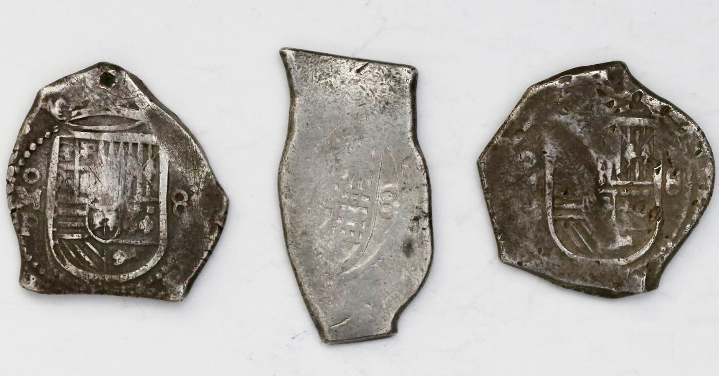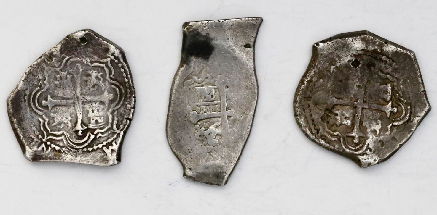 Lot of three Mexico City, Mexico, cob 8 reales, Philip IV and Charles II, assayer P or not visible. 75.00 grams total. An interesting trio, as one shows a bold oMP and shield and denomination 8 but with tiny hole at top, the second coin with same but weaker details with tiny punchmarks all over, and the last a neat, elongated shape with clear denomination 8, Fine on average, all but last toned.