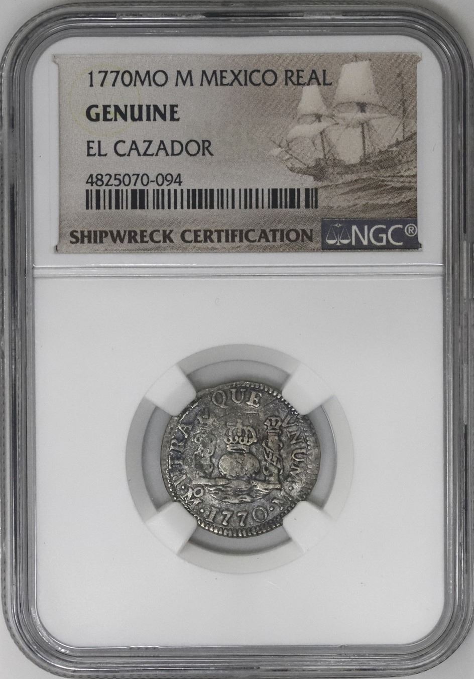 Lot of three Mexico City, Mexico, pillar 1R, Charles III, all NGC genuine / El Cazador: 1769M, 1770M and 1771F. KM-77. Moderately corroded yet fully detailed. NGC #4825070-087, -094, -112. With original certificates from the salvagers. Recovered from: Cazador, sunk in 1784 off New Orleans, Louisiana