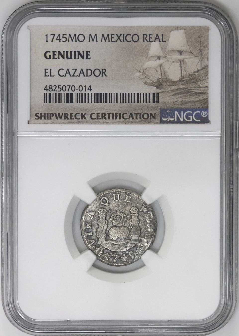 Lot of three Mexico City, Mexico, pillar 1R, Philip V, all NGC genuine / El Cazador: 1741MF, 1742M and 1745M. KM-75.1 and 75.2. Moderately corroded yet fully detailed. NGC #4825070-003, -006, -014. With original certificates from the salvagers. Recovered from: Cazador, sunk in 1784 off New Orleans, Louisiana