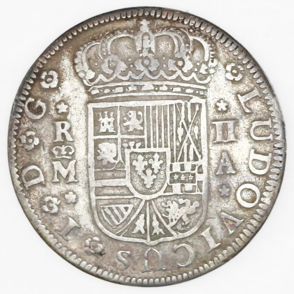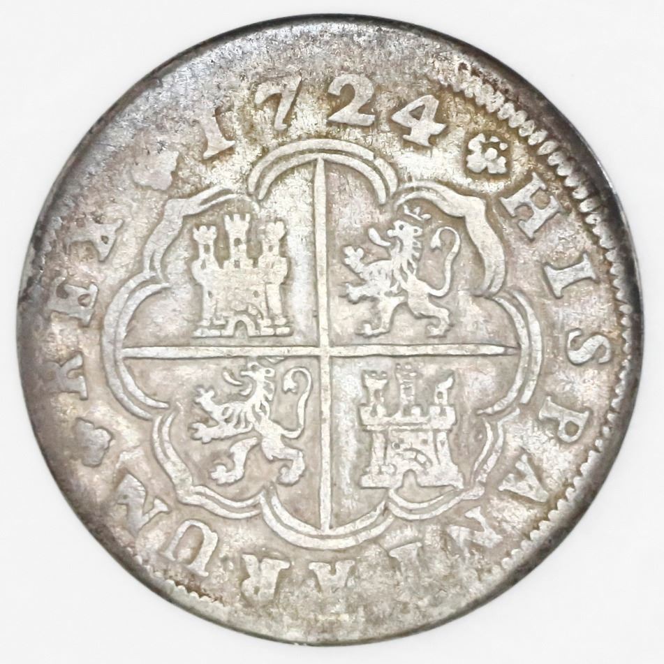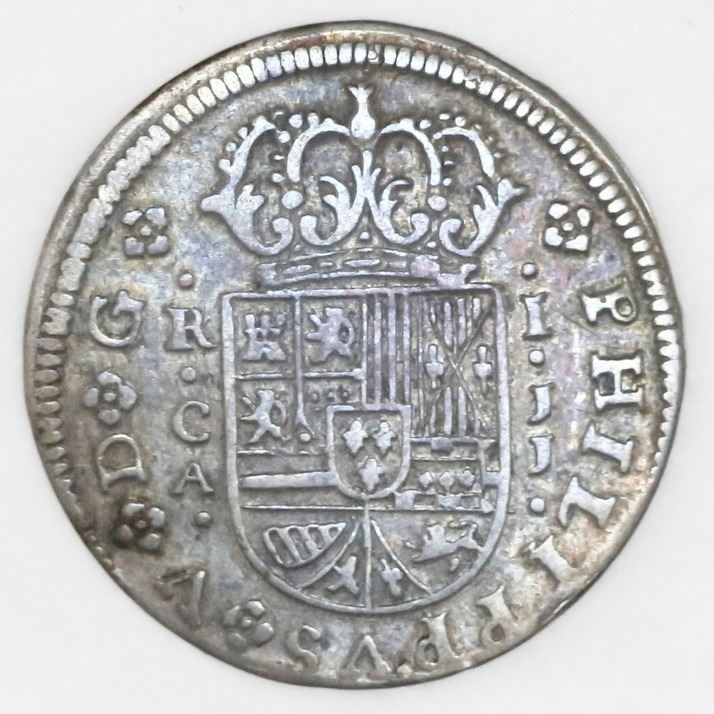 Lot of three Spain milled minors: Madrid, 2 reales "pistareen," Louis I, 1724A; Cuenca, 1 real, Philip V, 1719JJ; Seville, 1/2 real, Philip V, 1738PJ. 8.90 grams total. Generally VF with cleaning noted on the 2 reales, all darkly rainbow toned.