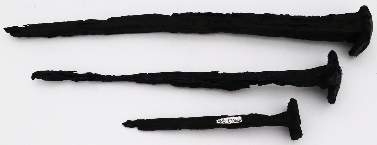 Lot of three iron spikes (conserved), ex-Atocha (1622). 425 grams total, 4-1/2" to 11" long. Mostly matte black, conserved spikes from small to large in size, almost full-headed with a squarish shank, grainy and worn away from corrosion but thoroughly stabilized, desirable provenance. From the Atocha (1622), with Fisher photo-certificates #61822 (1999) and 08A-81505 plus generic Fisher certificate.