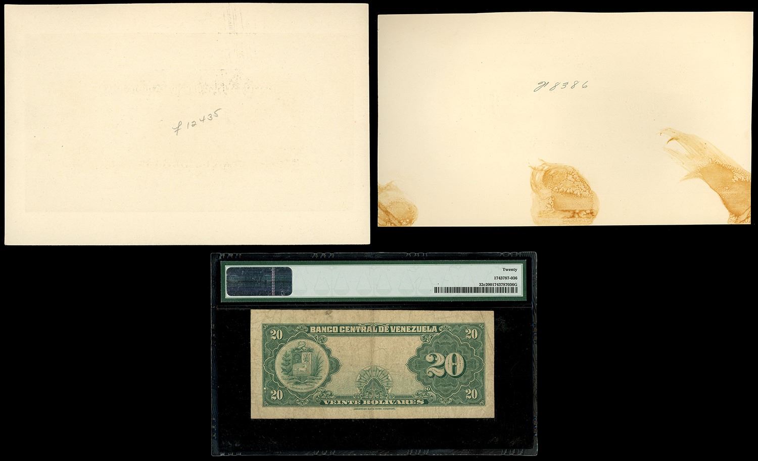Lot of three notes: Santo Domingo, Dominican Republic, 1000 pesos oro front proof, no date (1947); Caracas, Venezuela, Banco Central de Venezuela, 20 bolivares, 29-5-1958, serial S1757557, PMG VF 20; Maracaibo, Venezuela, Banco Comercial de Maracaibo, 10 bolivares reverse proof, no date (1929). SCWPM-67fp, 32c, S176bp. A mixed group of some interesting pieces, fit for the Latin American paper money specialist. Pedigreed to the Isaac Rudman Numismatic Cabinet.