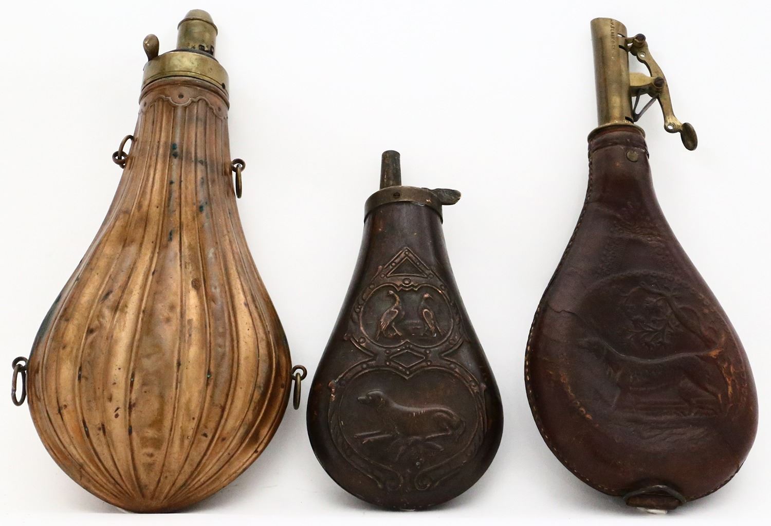 Lot of three powder and shot flasks, 1800s. 225 grams, 8-1/2" long; 90 grams, 8-1/2" long; 95 grams, 6" long. Large copper powder flask with four rings on sides and brass tip; smaller leather powder flask embossed with dog motif, marked "3 lbs" and spring measure top; small metal powder flask for a pistol, embossed with a sitting dog and birds. With photo-certificate