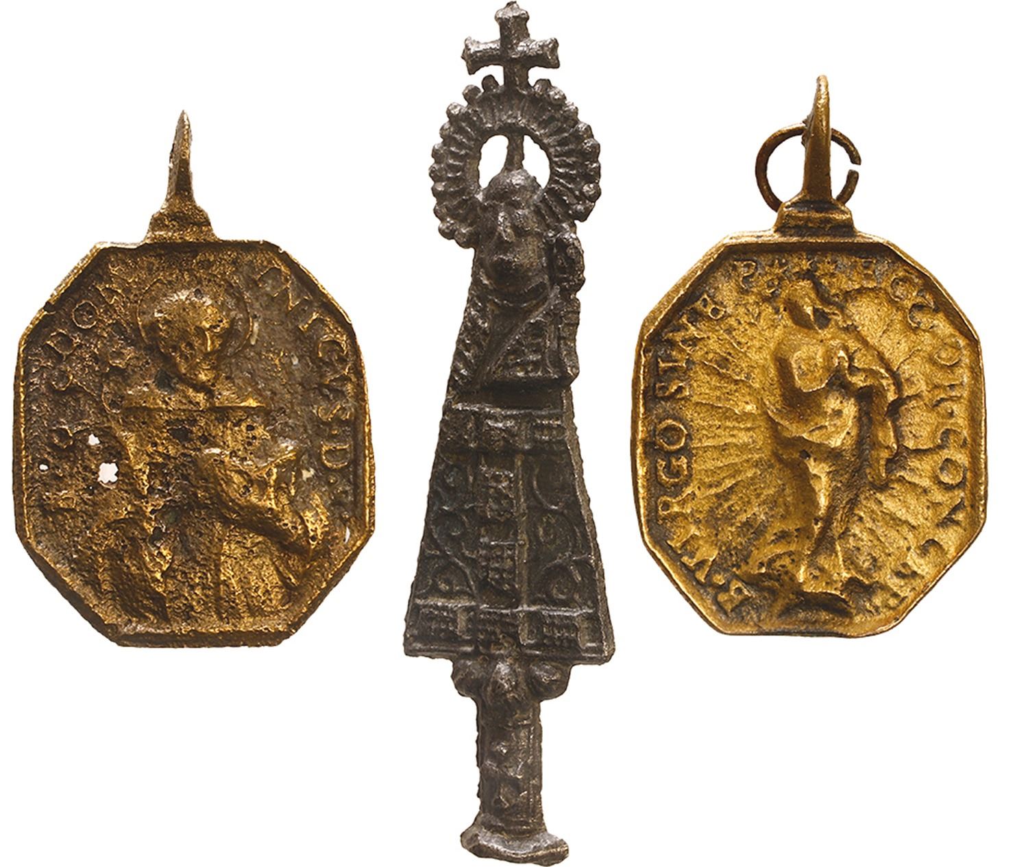 Lot of three small brass religious medallions, ex-Guadalupe-Tolosa (1724). 9 grams total. 2 are 1¼" long, 1 is 1¾" long. Three different types of religious medallions, two octagonal and light brass in color, the third a gray-black depiction of a saint with a cross atop, all with bails to affix to clothing or wear around the neck. From the Guadalupe-Tolosa (1724), with original certificate from Captain Tracy Bowden through his contract with the Dominican Republic and copy of the article "Graveyard of the Quicksilver Galleons" by Mendel Peterson from the December 1979 issue of National Geographic.