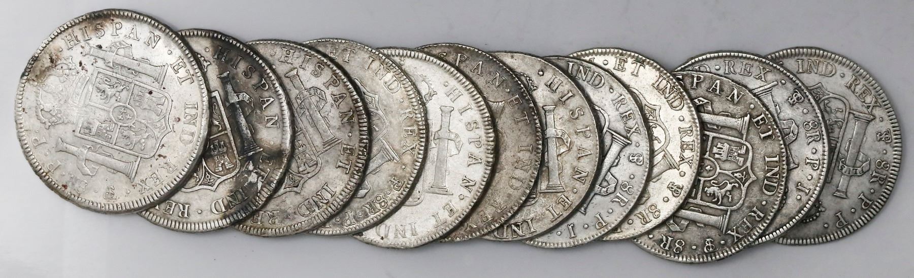 Lot of twelve Potosi, Bolivia, bust 8 reales, Charles IV: 1794PR, 1795PP, 1797PP (two), 1800PP, 1801PP, 1803PJ, 1804PJ, 1805PJ, 1806PJ, 1807PJ (two). 322.72 grams total. Grades range from VF to AU, mostly non-toned, some with light marks but no major problems.