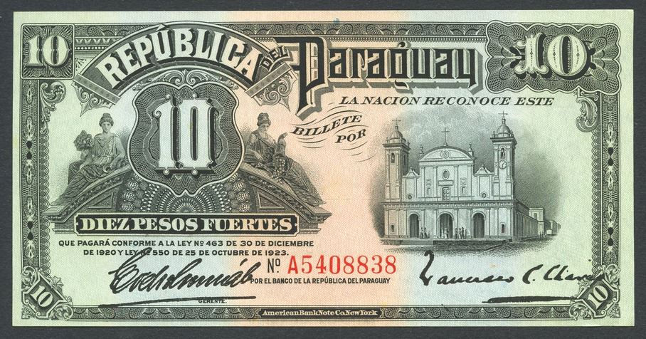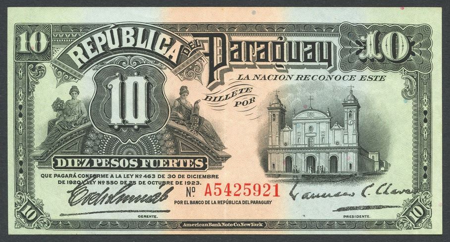 Lot of two Asuncion, Paraguay, Banco de la Republica, 10 pesos fuertes: 30-12-1920 and 25-10-1923.