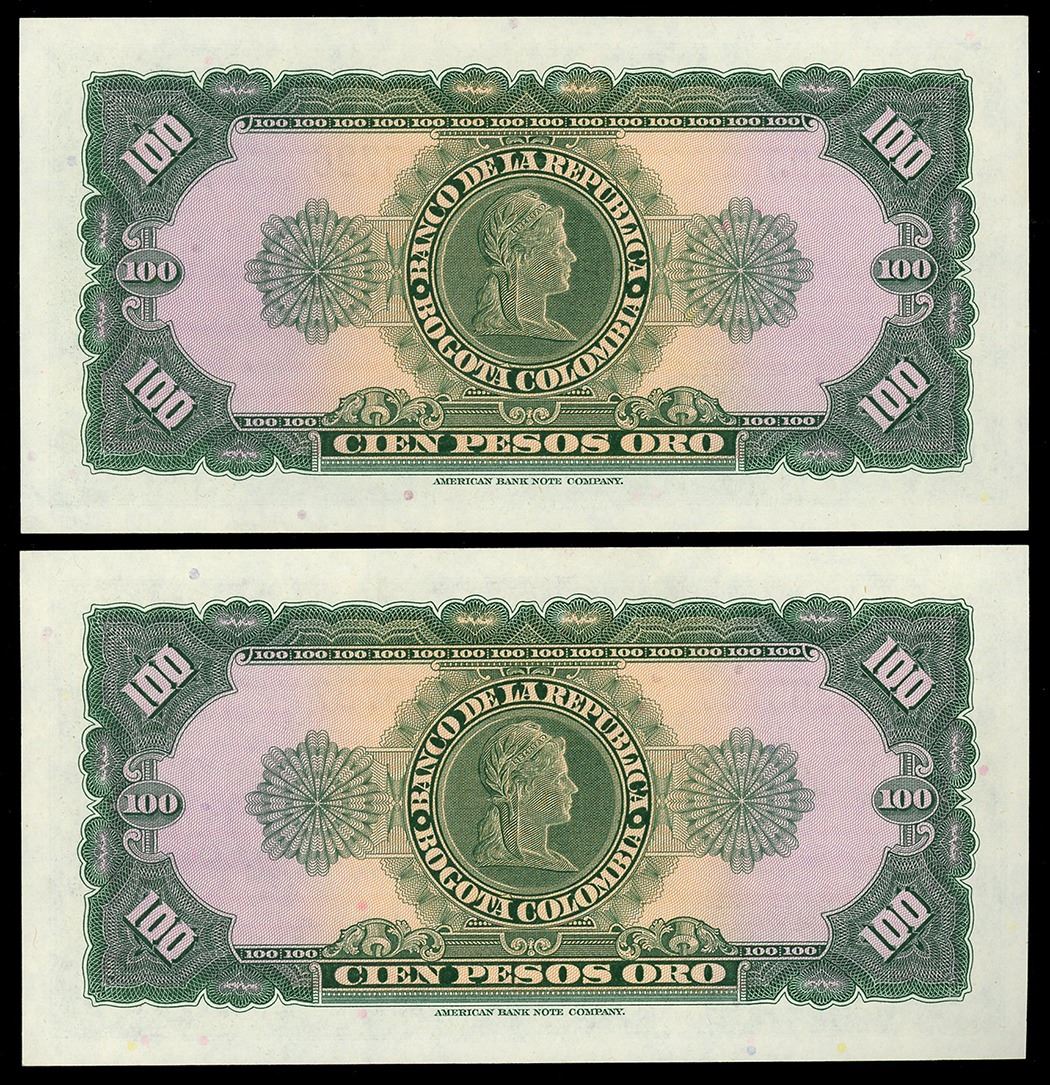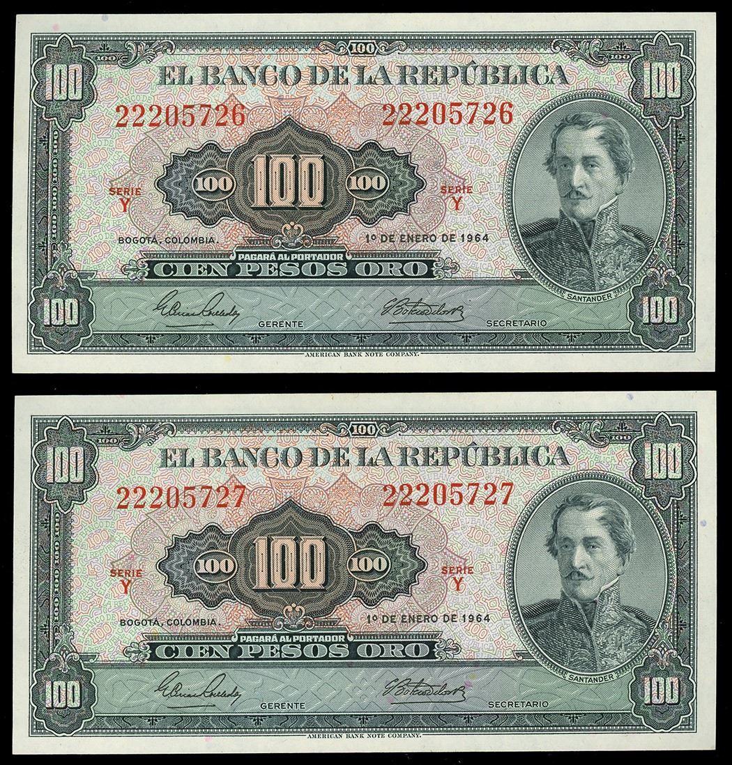 Lot of two Bogota, Colombia, Banco de la Republica, 100 pesos oro, 1-1-1964, series Y: serials 22205726 and 22205727. SCWPM-403. Both notes are UNC with nice centering.