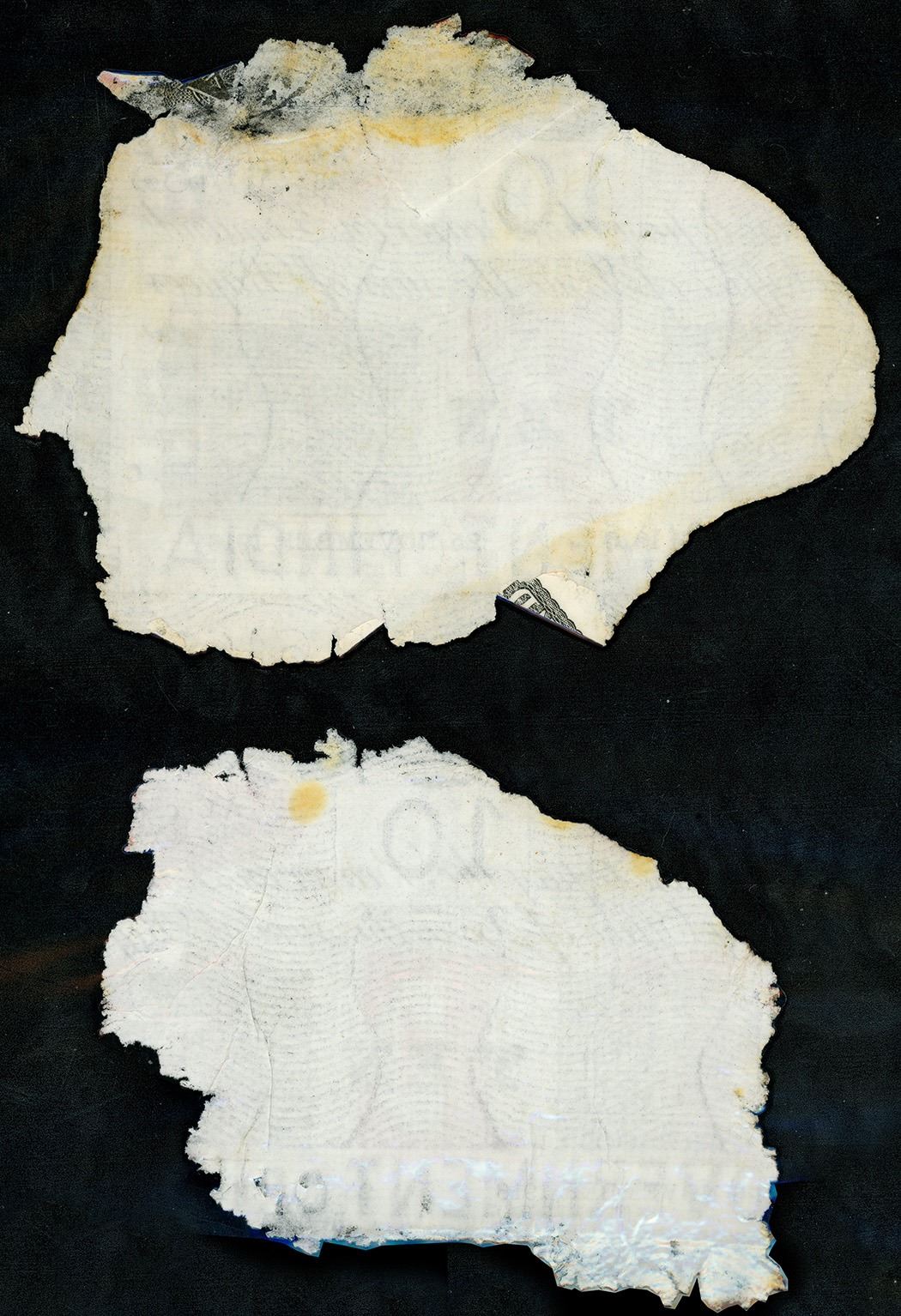 Lot of two Calcutta, British India, 10 rupees, 25-1-1916, series AC 48, serial 80485 and 85(?), laminated. SCWPM-A10f. Partially intact (60-75%) with light staining and circular degradation pattern (typical), one choice example with full serial. With certificate from the salvager. Recovered from: Camberwell, sunk in 1917 off Isle of Wight, south of England