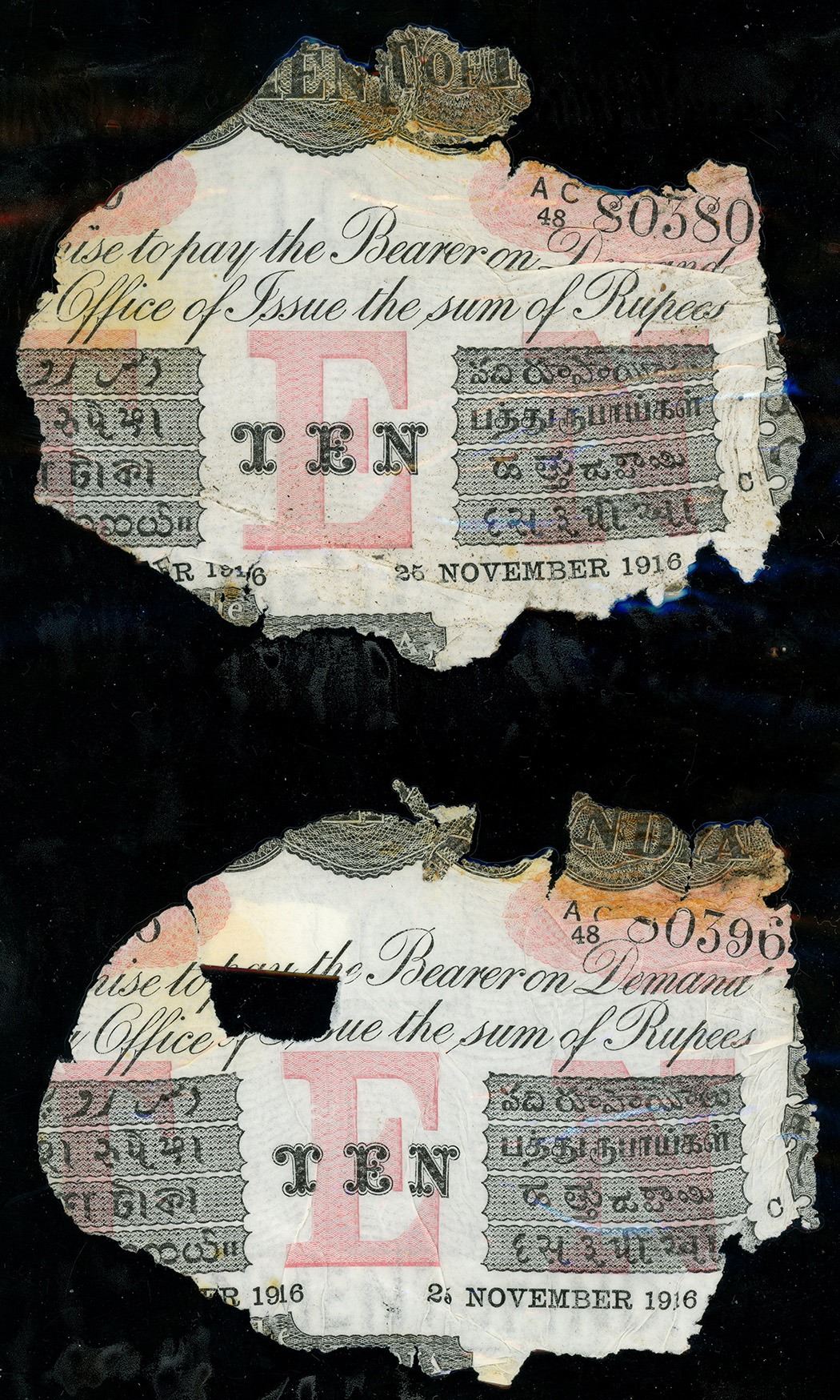 Lot of two Calcutta, British India, 10 rupees, 25-1-1916, series AC 48, serials 80380 and 80396, laminated. SCWPM-A10f. Partially intact (60-75%) with light staining and circular degradation pattern (typical), with full serials. With certificate from the salvager. Recovered from: Camberwell, sunk in 1917 off Isle of Wight, south of England
