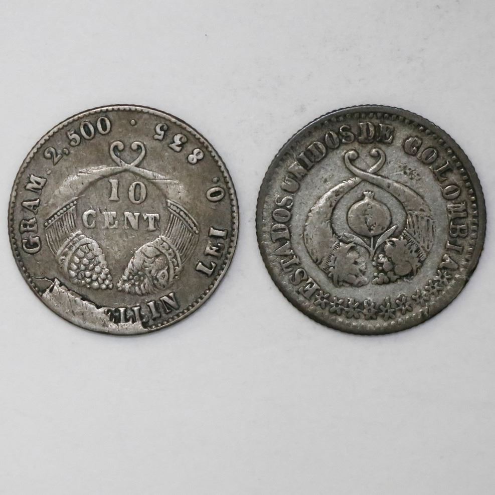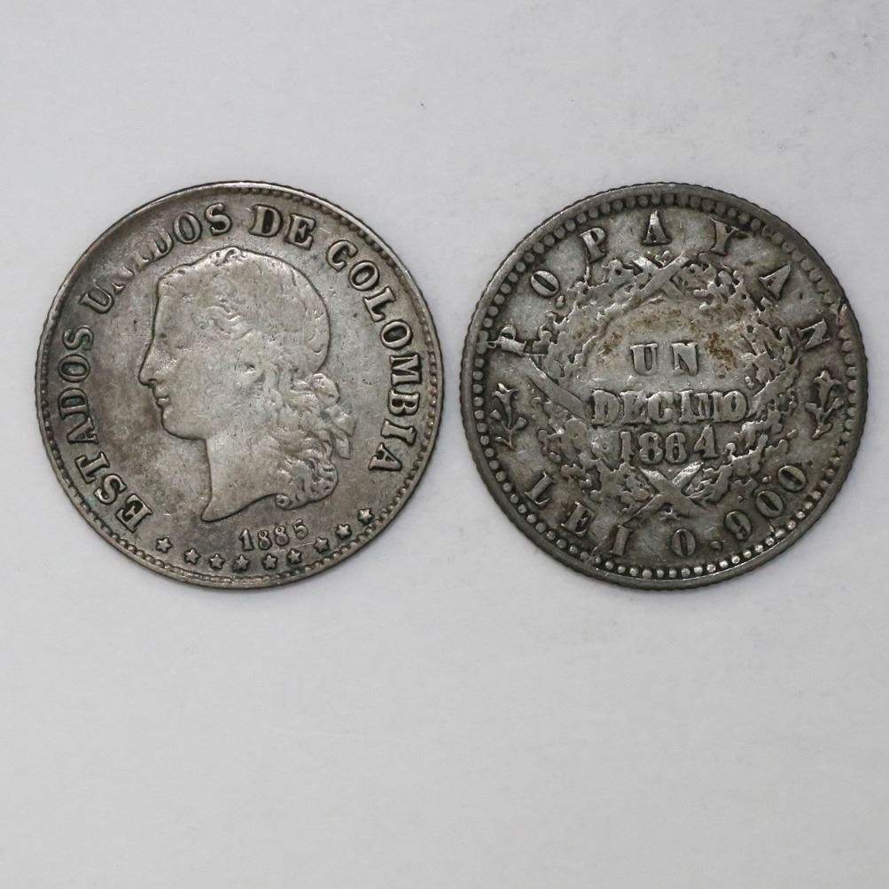 Lot of two Colombia coins: Popayan, 1 decimo, 1864, 0.900 fineness; Medellin, 10 centavos, 1885, 0.8