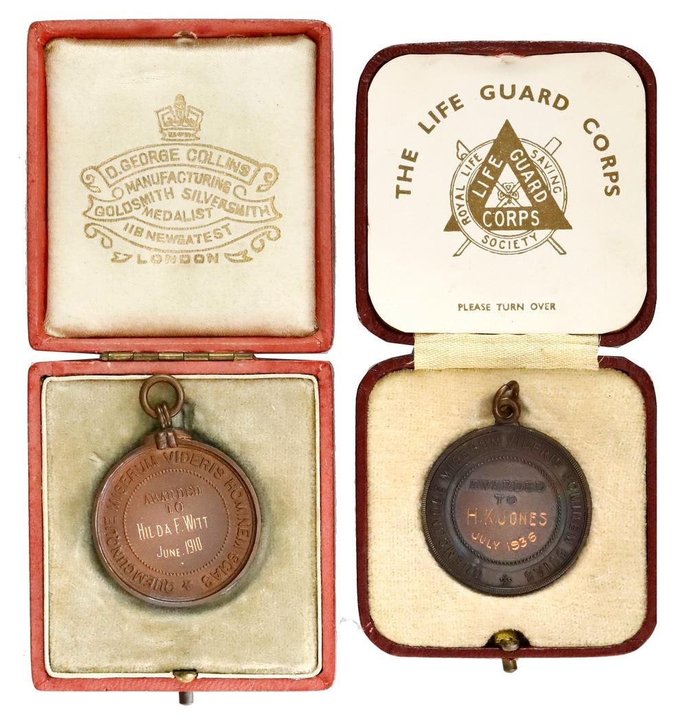 Lot of two Great Britain Royal Life Saving Society bronze medals in original presentation boxes, engraved with dates 1910 and 1936, ex-Malone. Obverse: rescue scene in water at center, THE ROYAL LIFE SAVING SOCIETY above and ESTABLISHED 1891 below; reverse: AWARDED TO at center surrounded by beading, QUEMCUNQUE MISERUM VIDERIS HOMINEM SCIAS encircling; smooth edge. Very similar design shared between the two, one awarded to Hilda F. Witt in June 1910, the other awarded to H.K. Jones in July 1936, quite rare to find still in their original cases. Pedigreed to the Bart Malone Collection.